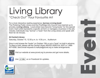 The Pickering Public Library and Pineridge Arts Council are hosting a Living Library event on October 15, where local artists act as 'living books' that attendees can engage with for 30 minutes. The event showcases a diverse range of artistic talents, from theater and music to pottery and visual arts, promoting community engagement and cultural appreciation. Participants can either browse the artists on-site or reserve a session in advance through the library.