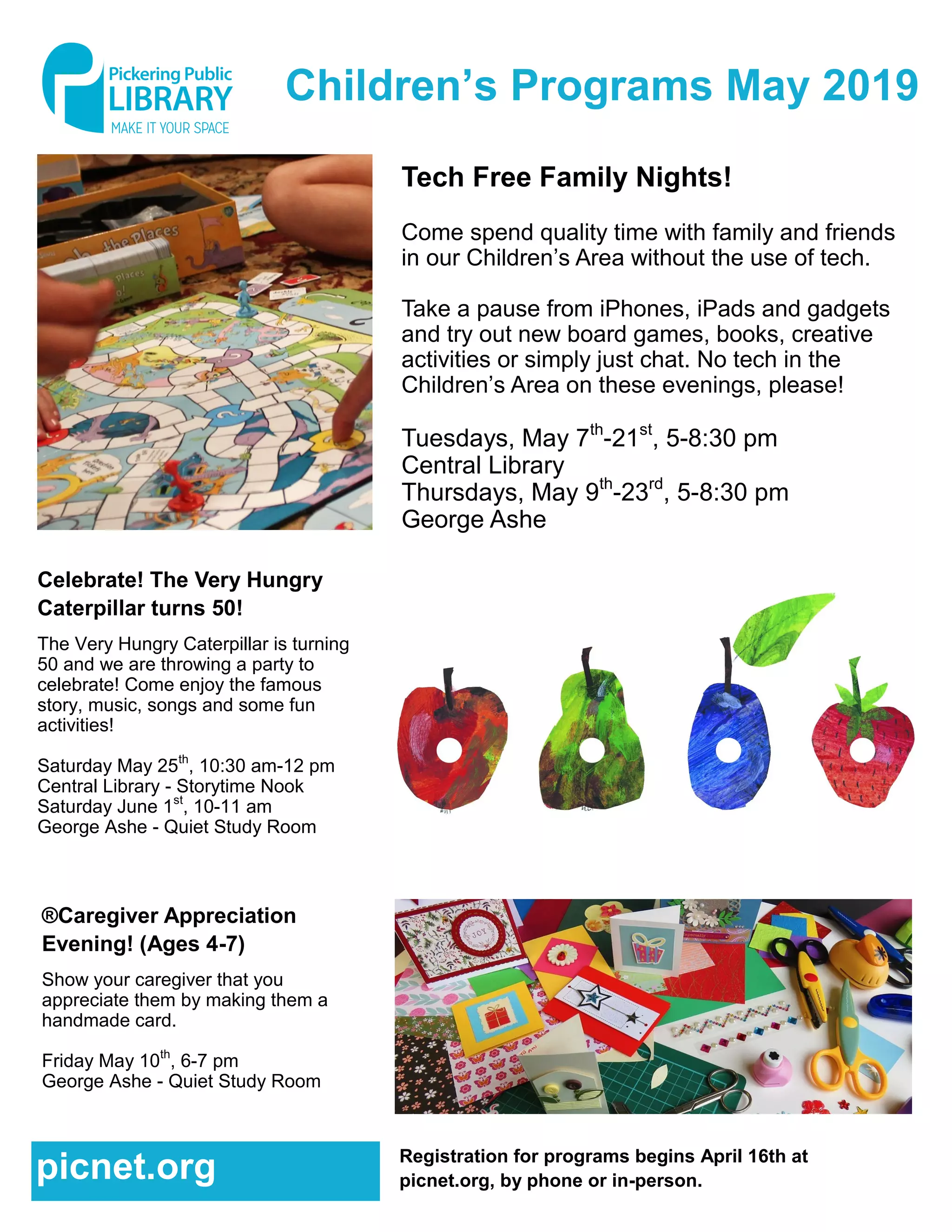 The document outlines children's, teen, and adult programs offered in May 2019, including tech-free family nights and events for celebrating 'The Very Hungry Caterpillar's' 50th anniversary. Registration for programs begins April 16th and includes activities such as storytime, financial literacy workshops, and maker space events. Specific sessions focus on topics like pet care, roommate agreements, and DIY projects, with various formats available upon request.