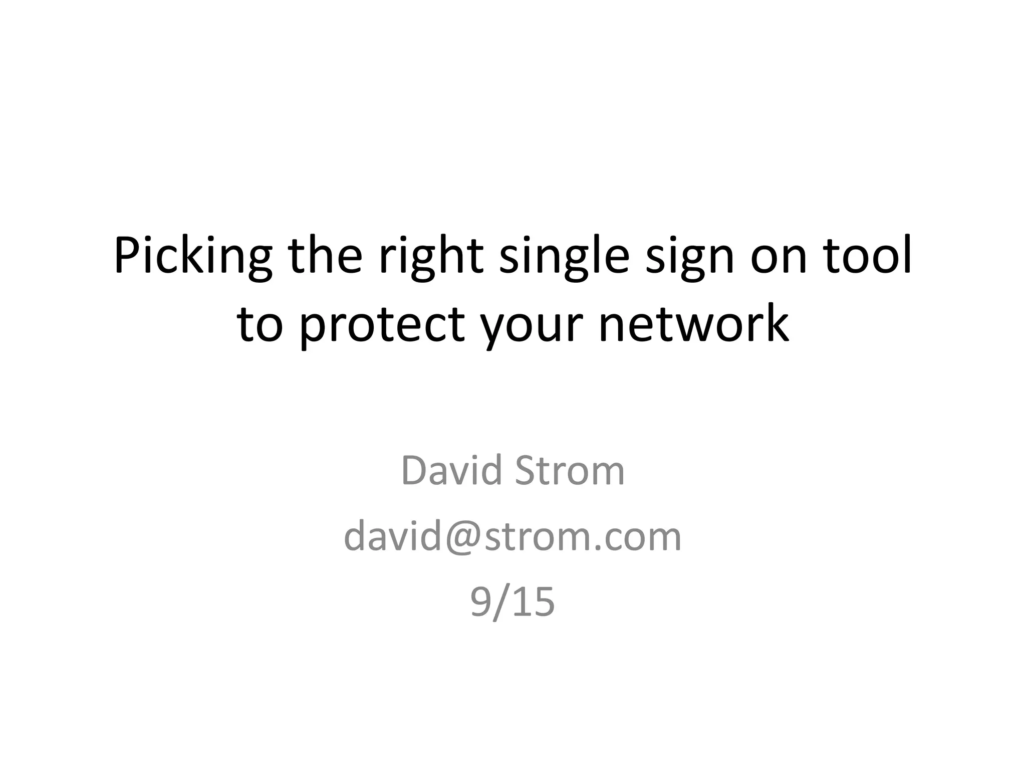 The document summarizes new developments in single sign-on (SSO) tools, including acquisitions and product launches. It reviews several SSO products and notes other vendors who declined participation. Five trends are highlighted: 1) growing use of multi-factor authentication, 2) increased integration with mobile device management, 3) cloud services dominance, 4) identity providers, and 5) proliferation of applications. The author provides contact information and links for additional information.