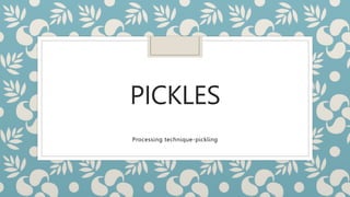 This document discusses the process of pickling fruits and vegetables. Pickling involves immersing produce in brine or vinegar to preserve it. Ancient Mesopotamians discovered pickling over 4000 years ago using cucumbers. The pickling process involves placing produce in a salt brine solution which draws moisture out through osmosis. Lactic acid bacteria in the produce ferment in the brine, producing lactic acid which preserves the food. Proper salt concentration and temperature are needed for fermentation. Pickles can also be made by soaking produce in vinegar or oil, or combinations of ingredients like salt, vinegar, oil and spices. The document outlines different types of pickles and considerations for each method.