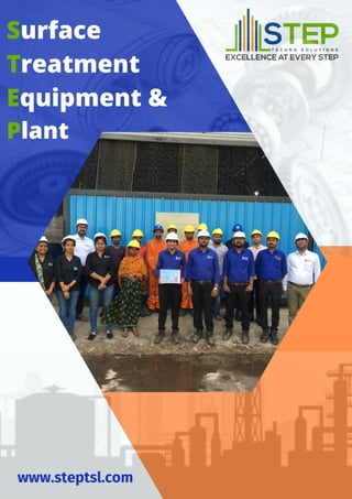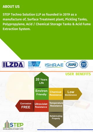 STEP Techno Solution LLP was founded in 2019 and manufactures surface treatment plants, pickling tanks, polypropylene tanks, and acid extraction systems. They have experience designing plants for various surface treatment methods like galvanizing, anodizing, electroplating, and offer pretreatment tanks, fume extraction systems, acid storage tanks, and ETP plants. Their tanks are made from German welding technology with chemical-resistant coatings and reinforcements to withstand chemicals. They also provide acid storage tanks and customized fume extraction systems to reduce dangerous emissions and protect personnel and facilities from chemicals.