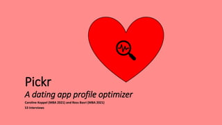 The document describes Pickr, a dating app profile optimizer created by Caroline Koppel and Ross Basri. It aims to help users optimize their dating app profiles through photo selection, feedback, and targeting advertising partners. Key aspects include:
