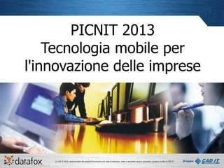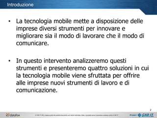 Il documento tratta dell'uso della tecnologia mobile per migliorare l'innovazione nelle imprese, presentando strumenti come app, sempre connessi, e geolocalizzazione. Vengono illustrate quattro soluzioni specifiche: Mobile Maint, SOS Conf, iConf e QRline, ciascuna con funzionalità che ottimizzano efficienza e comunicazione. Inoltre, viene evidenziato come la tecnologia mobile possa ridurre costi e fornire informazioni in tempo reale.