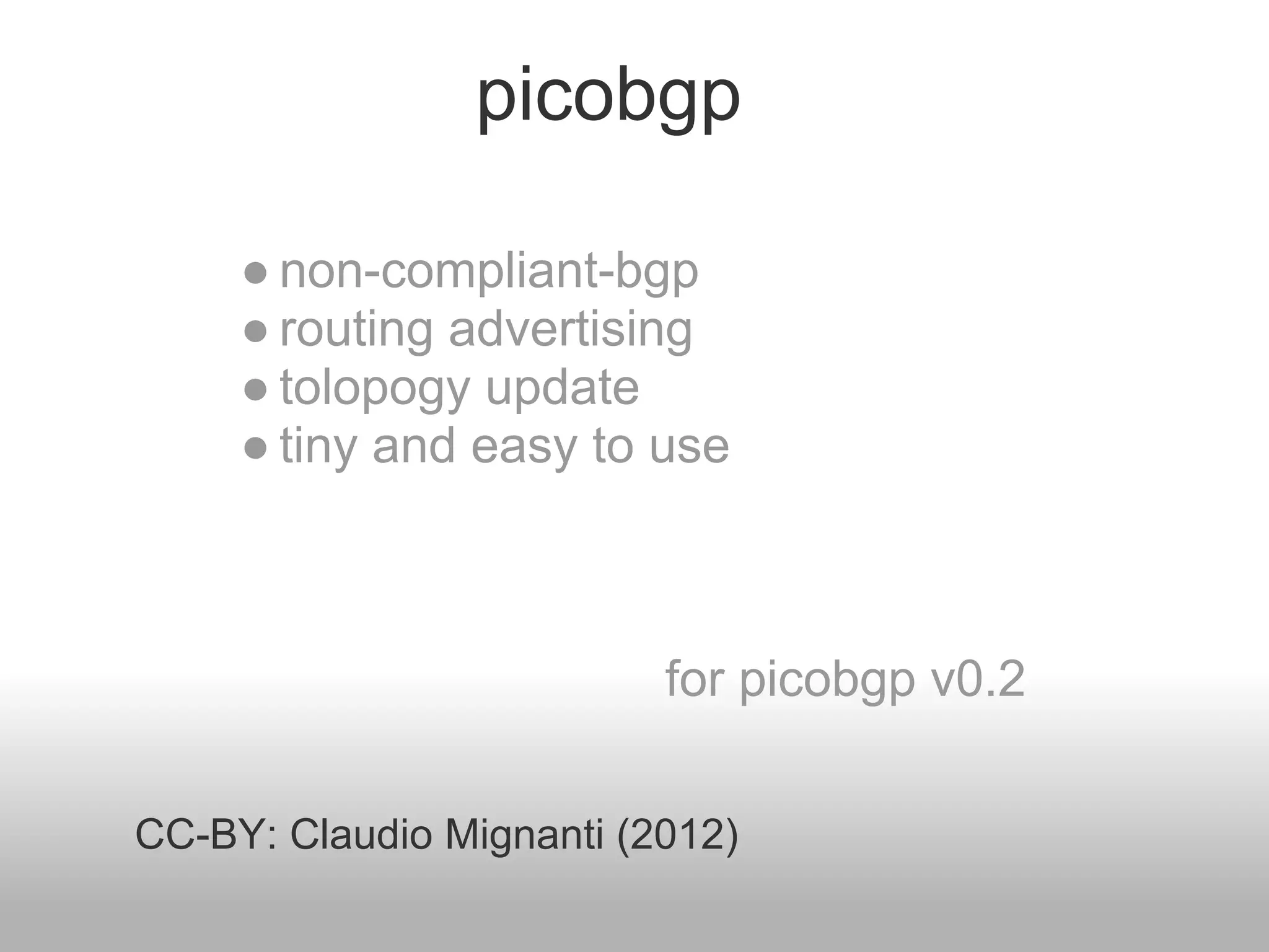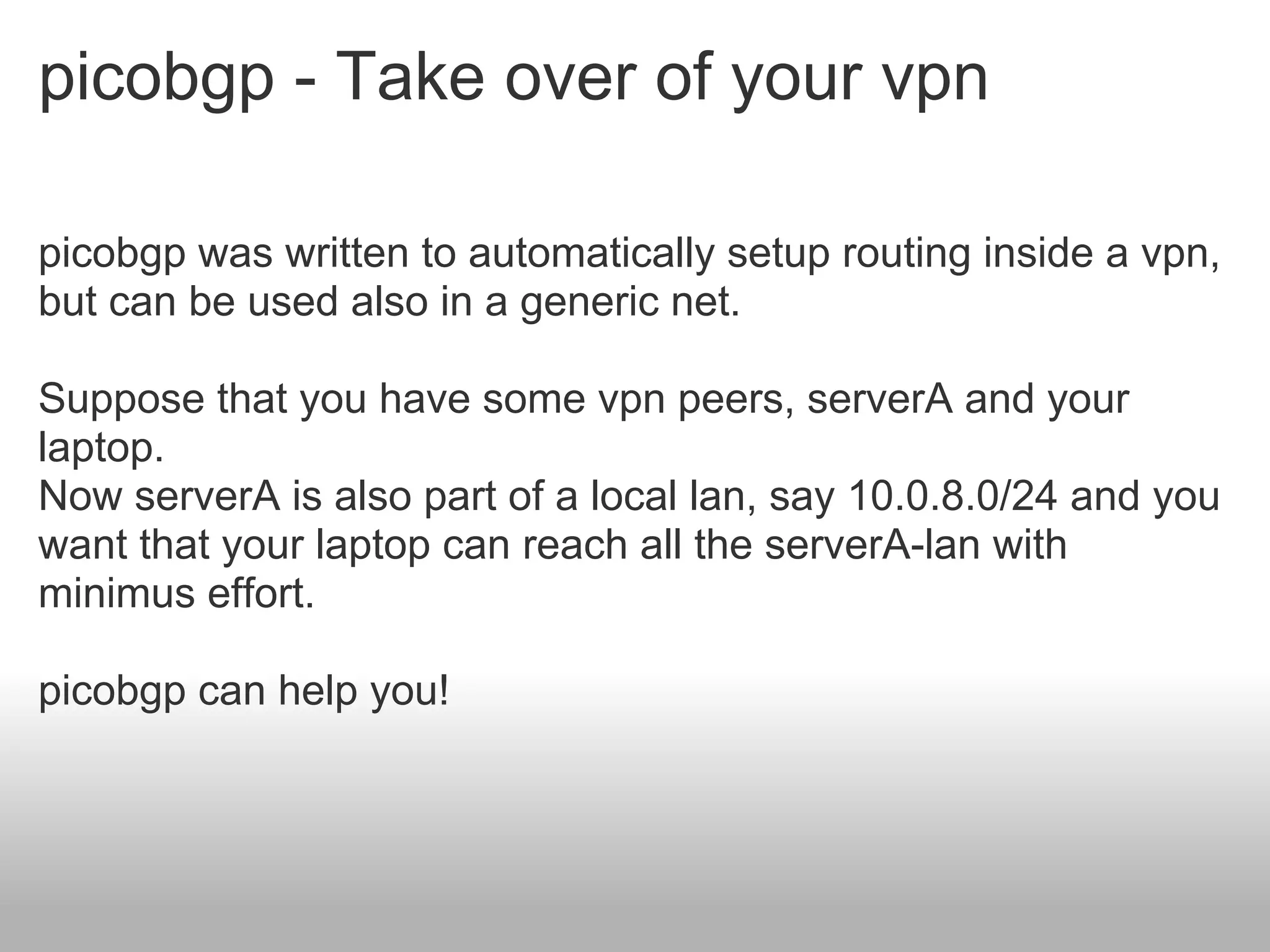 Picobgp is a small and easy to use BGP routing software that can automatically setup routing within a VPN or generic network. It allows routing advertisements and topology updates with minimal configuration by command line arguments. Key features include routing advertising, topology updates, and being tiny and easy to use.