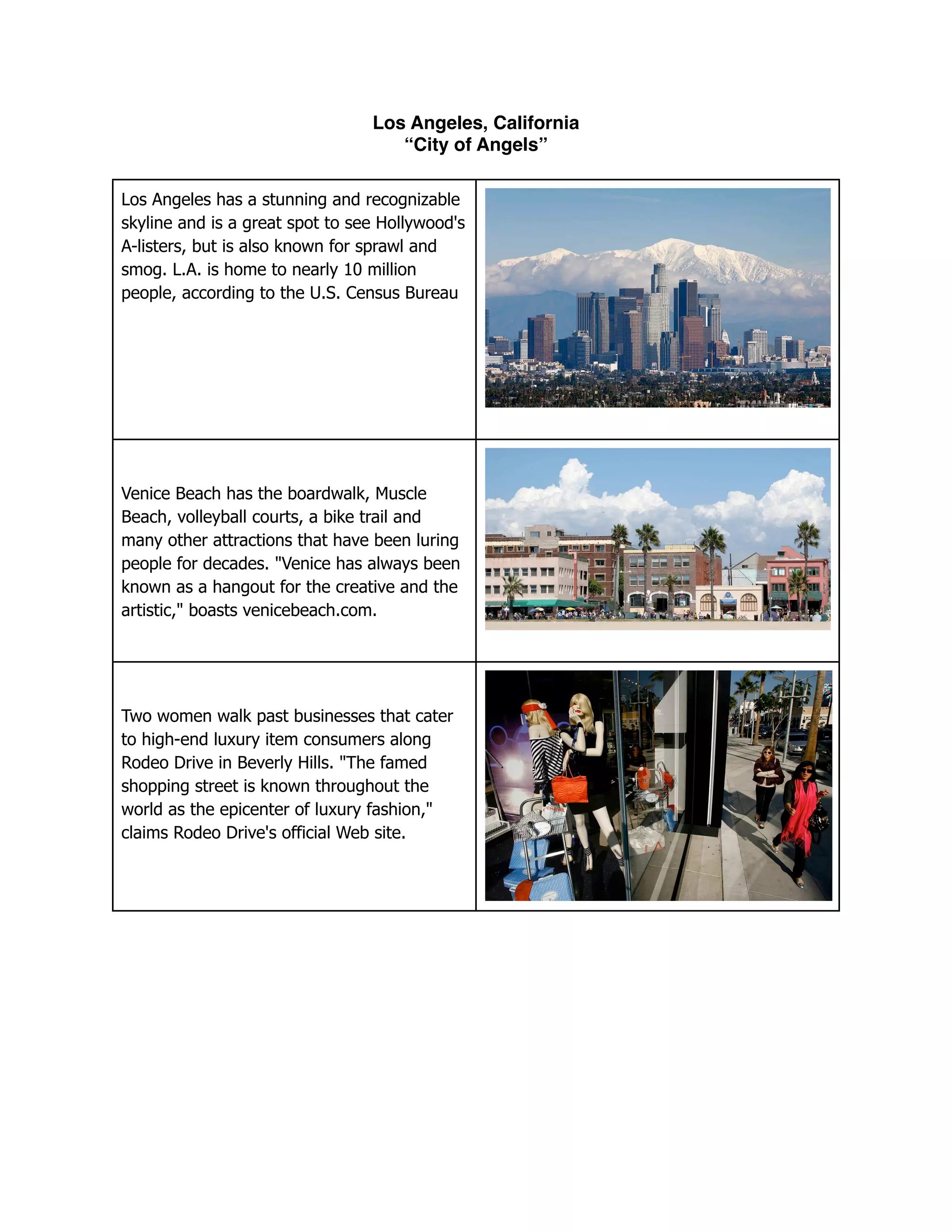 Los Angeles is known for its iconic Hollywood Sign and Walk of Fame, as well as attractions like Venice Beach, Rodeo Drive in Beverly Hills, and the Santa Monica Pier ferris wheel. The document discusses several famous landmarks and attractions that have made LA famous, including the original Grauman's Chinese Theatre, Olvera Street marketplace, and the Farmers Market, highlighting their history and cultural significance.