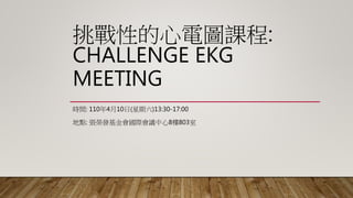 挑戰性的心電圖課程: CHALLENGE EKG MEETING 時間: 110年4月10日(星期六)13:30-17:00 地點: