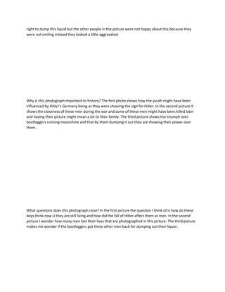 The photograph shows three different scenes: 1) German boys saluting Hitler in the 1930s-40s, 2) WWII soldiers smiling together despite fighting, and 3) men dumping moonshine as others watch unhappily in 1940s US. The photographer aimed to convey German youth's support for Hitler, camaraderie among soldiers, and authorities asserting power over bootleggers. The photos provide historical insights but also raise questions about the subjects' later lives and experiences.