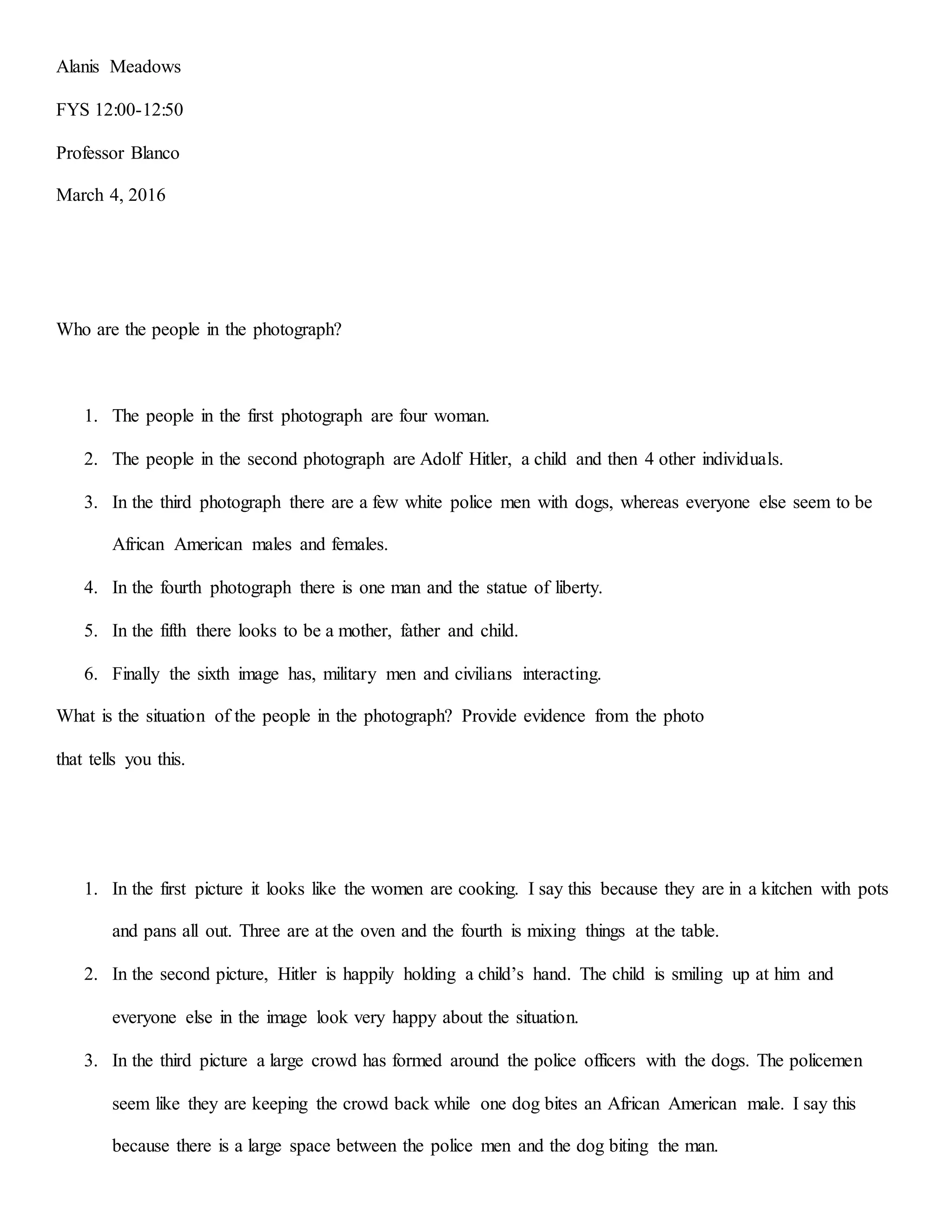 This document analyzes 6 historical photographs. For each photo, the document describes the people, deduces the situation, infers the photographer's message, explains the photo's importance to history, raises questions, provides a caption, and suggests finding more information. The photos depict women in the early 20th century, Hitler with a child, segregation-era police with dogs, a man hanging from the Statue of Liberty, immigrants at the Statue of Liberty, and military recruitment. Overall, the document examines how the photos provide insights into tragic periods of history.