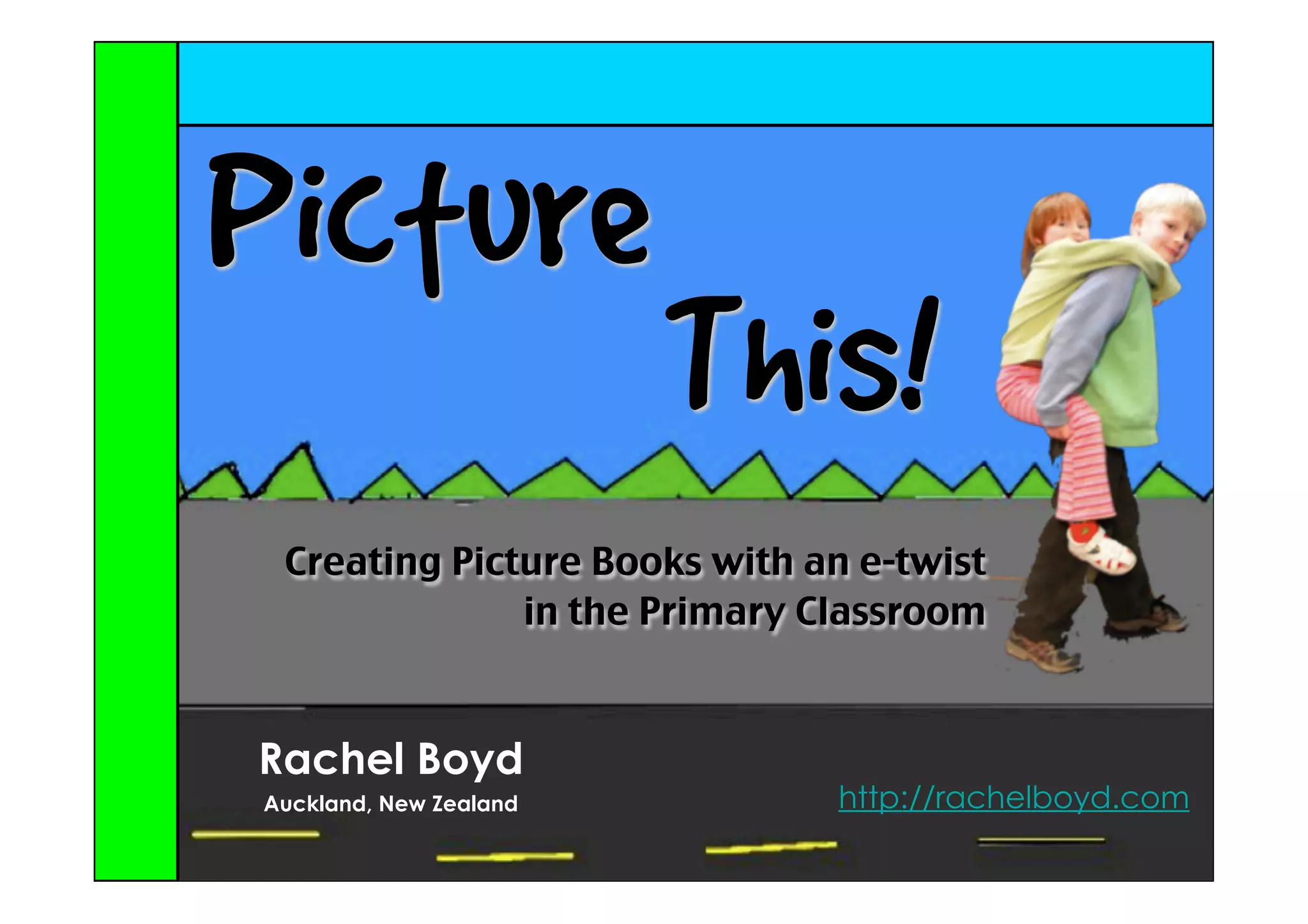 The document discusses the process of creating picture books in primary classrooms, emphasizing the use of e-tools and collaborative techniques to engage students. It outlines steps for brainstorming story elements, drafting, storyboarding, and feedback for refining both text and illustrations. Various resources and links for tools and inspiration are provided to assist teachers and students in this creative endeavor.