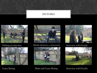 Filming was conducted for a documentary, including interviews with Gouhir, a teacher, and Debbie dressed as a transsexual. Photographs show Maria Younes and Luara filming various interviews and scenes.