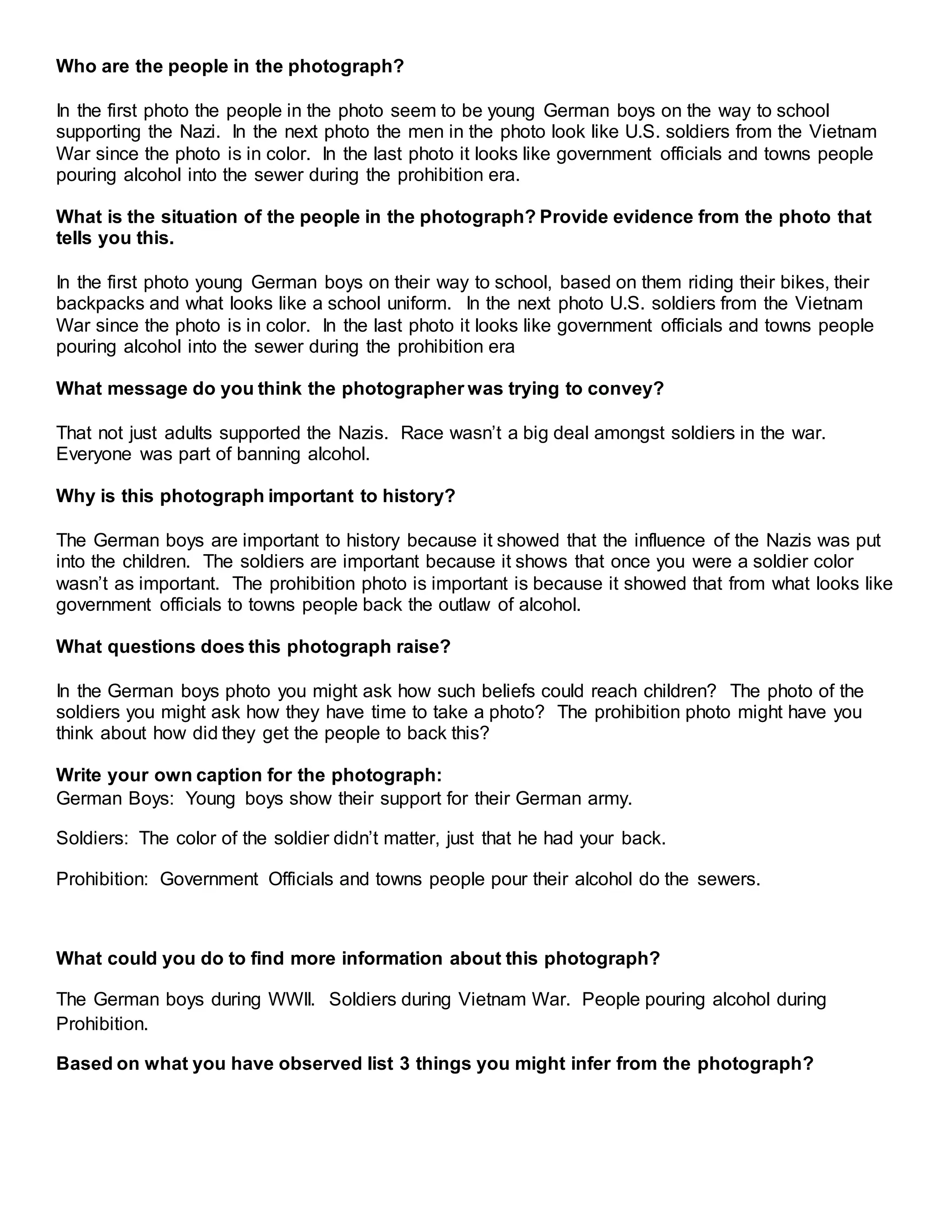 The document analyzes 3 historical photographs - one showing young German boys supporting the Nazi party, another of US soldiers from the Vietnam War, and a third of officials and townspeople pouring alcohol into sewers during Prohibition. It infers details about the subjects and situations depicted based on visual evidence. The purpose is to convey how the photos provide important historical insights, such as Nazi indoctrination of youth, racial integration among soldiers, and public support for banning alcohol.