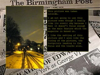 The document discusses potential pictures to use in a music magazine. It evaluates several pictures based on whether they focus enough on the main subject, the lighting, backgrounds, and other compositional elements. While some pictures are liked overall, issues like busy backgrounds, subjects cut off, or shadows could require cropping or editing before using in the magazine layout. The best picture is considered one with a landscape view, good lighting, and a less formal feel suiting the target audience.