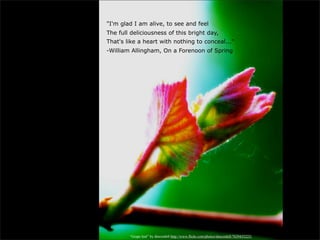 This document contains summaries of 30 poems for National Poetry Month. Each summary is 1-2 sentences and provides the title of the poem, author and a brief description of the theme or subject matter. Images from Flickr accompany many of the poem summaries. The poems cover a wide range of topics from nature and seasons to love, curiosity, identity and more.