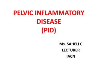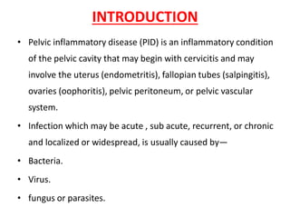 Pelvic inflammatory disease (PID) is an inflammatory condition of the pelvic cavity that is usually caused by bacteria like gonorrhea and chlamydia. It begins with cervicitis and can spread to the uterus, fallopian tubes, ovaries, and pelvic peritoneum. Risk factors include young age, multiple sexual partners, history of STDs, and procedures like IUD insertion. Symptoms include lower abdominal pain and vaginal discharge. Diagnosis involves history, exam noting cervical motion tenderness, and tests. Treatment is hospitalization, IV antibiotics, and educating partners to prevent reinfection. Complications can include infertility, ectopic pregnancy, and chronic pelvic pain.