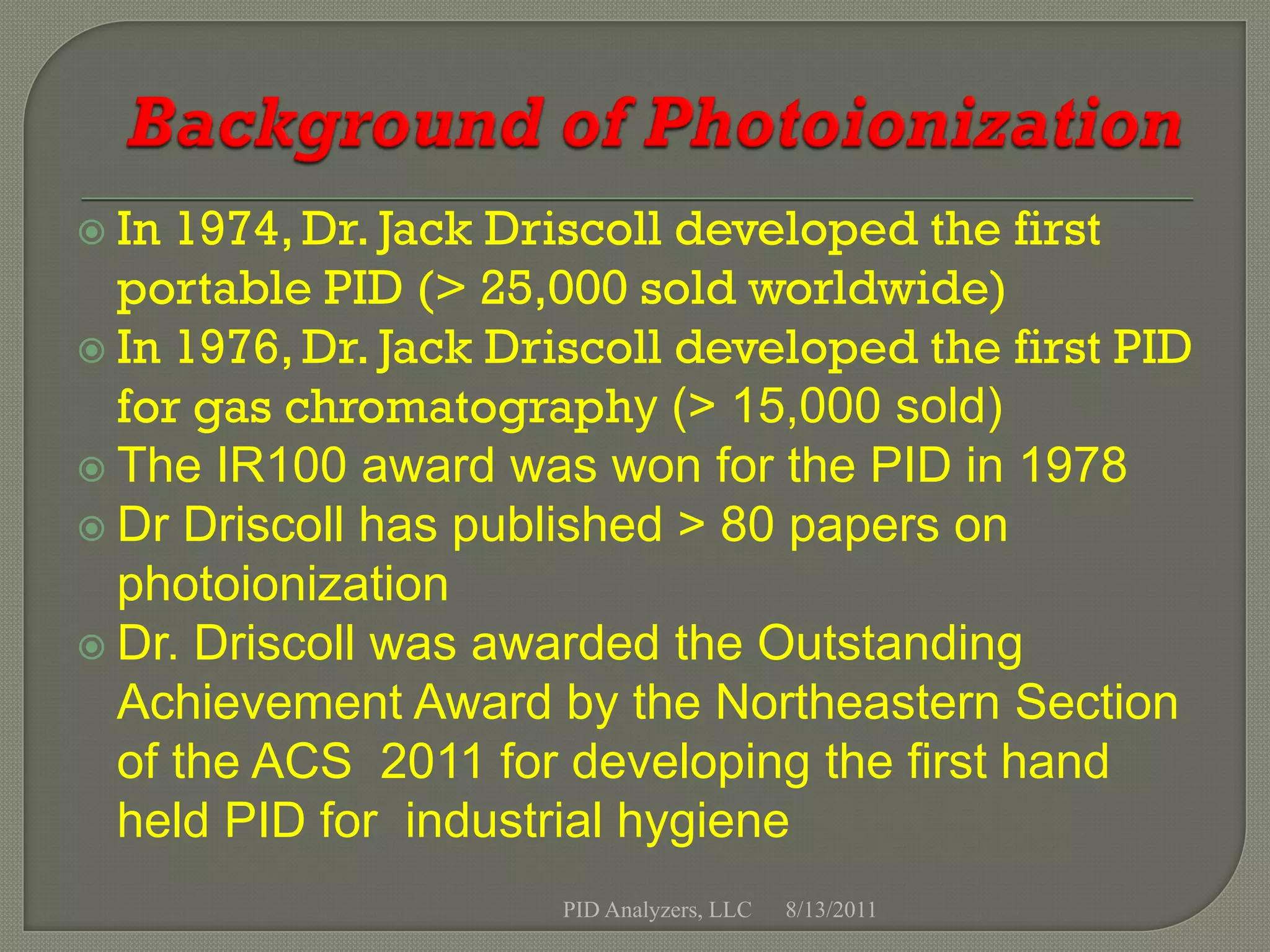 Dr. Jack Driscoll developed the first portable photoionization detector (PID) in 1974 and the first PID for gas chromatography in 1976. He has published over 80 papers on photoionization and won the IR100 award for the PID in 1978. In 2011, he received an Outstanding Achievement Award from the Northeastern Section of the American Chemical Society for developing the first handheld PID for industrial hygiene applications.