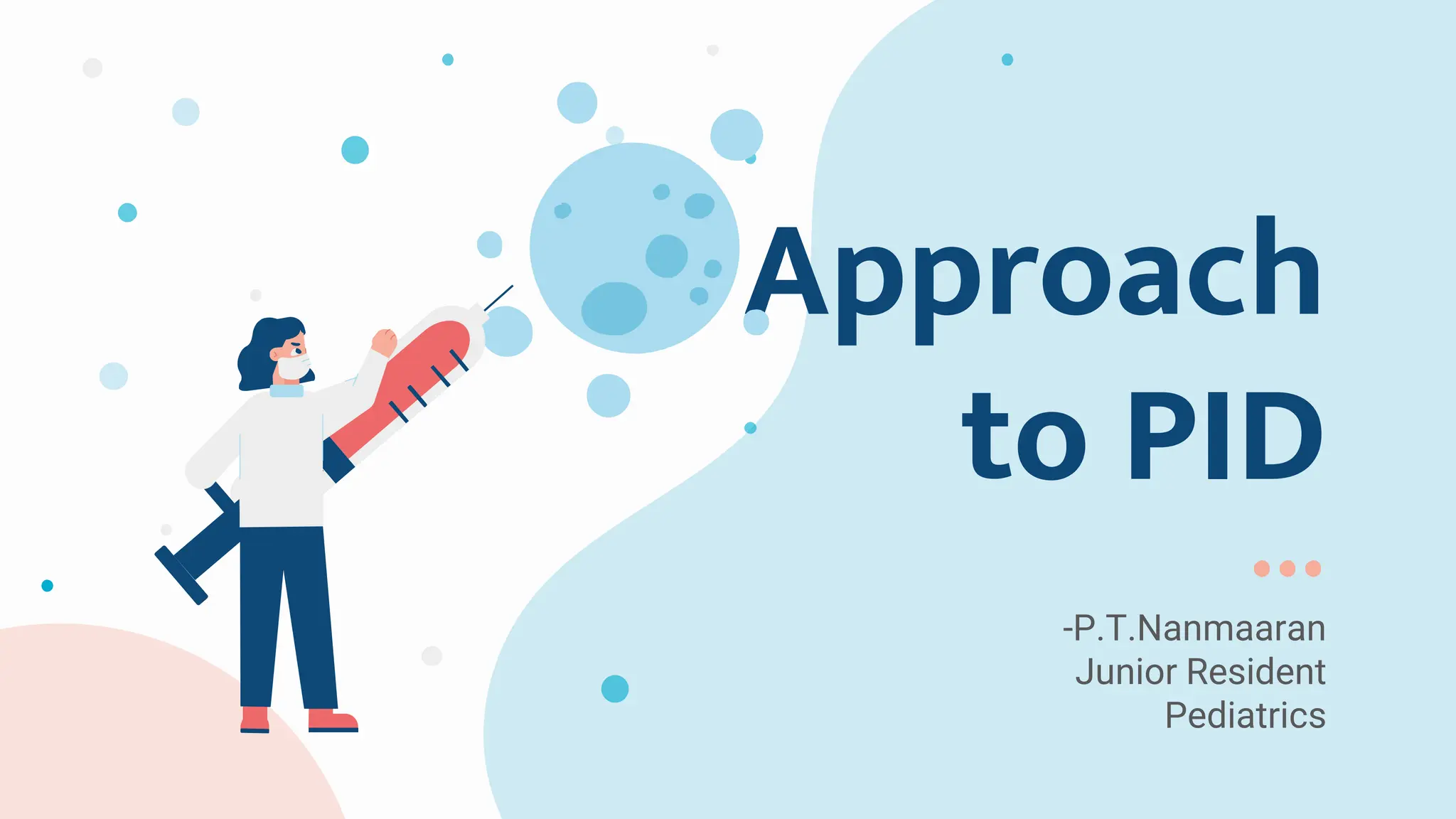 The document provides background information on primary immunodeficiency diseases (PIDs) and discusses their approach and management. It notes that over 350 PIDs have been identified so far. PIDs are classified based on the component of the immune system involved, such as combined antibody and T-cell deficiencies. Clinical markers for specific PIDs include recurrent infections, eczema, hair abnormalities, and organ involvement. Case scenarios demonstrate examples of SCID, LAD, CGD, agammaglobulinemia, and SCN. Screening tests and CBC findings are discussed to rule out certain PIDs. Management involves hematopoietic stem cell transplantation or IVIG replacement depending on the disorder.