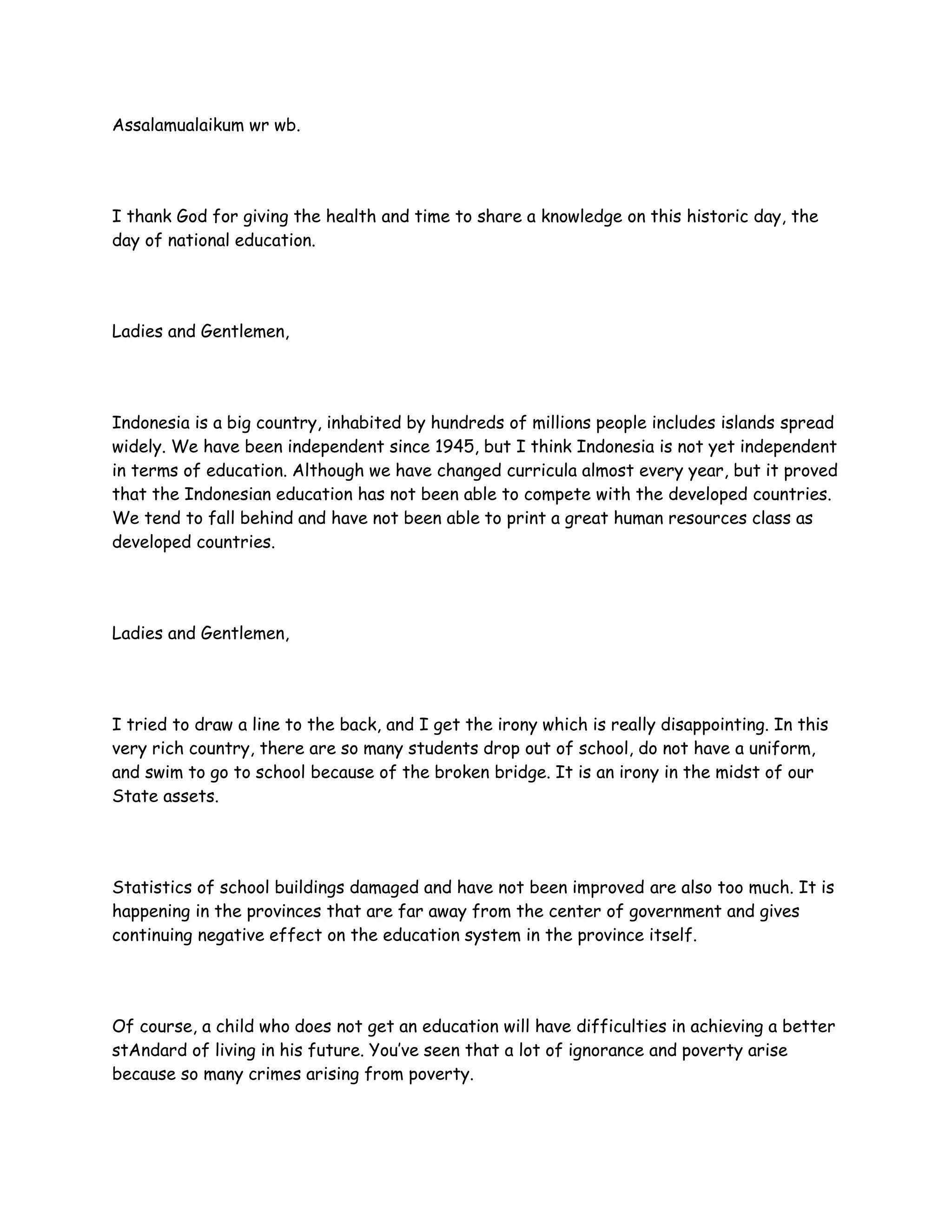 This document discusses issues with Indonesia's education system and calls for improvements. It notes that while Indonesia has been independent since 1945, it is not yet independent in education as curricula changes often but the system still lags behind developed countries. The document highlights problems like many students dropping out of school due to lack of uniforms or broken bridges, as well as damaged school buildings in remote areas, perpetuating poverty and ignorance. It argues that education is key to better social order and developing high-quality human resources, and calls on students, teachers and all Indonesians to continue struggling for educational independence and not give up on improving the nation's future through education.