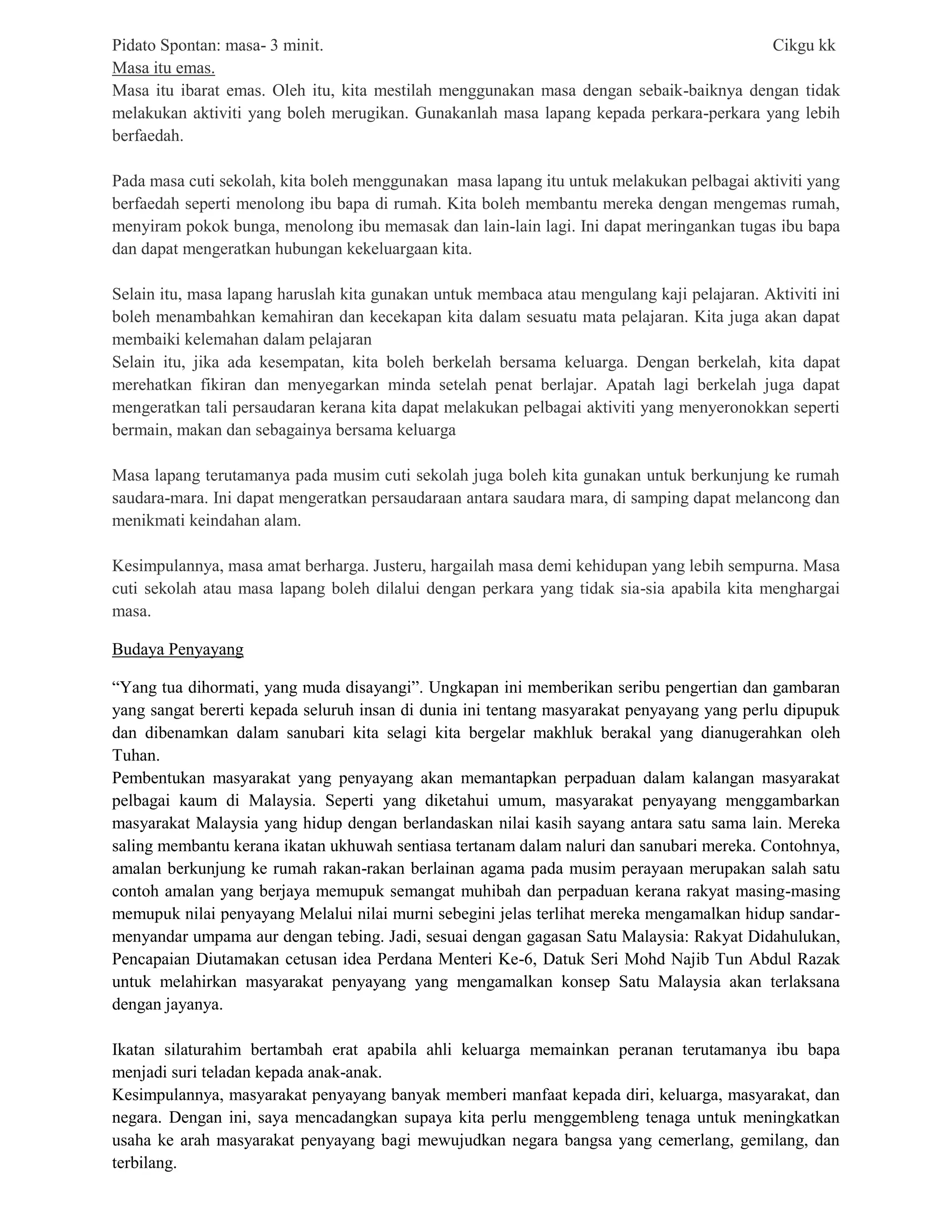Pidato Spontan: masa-3 minit. Cikgu kk
