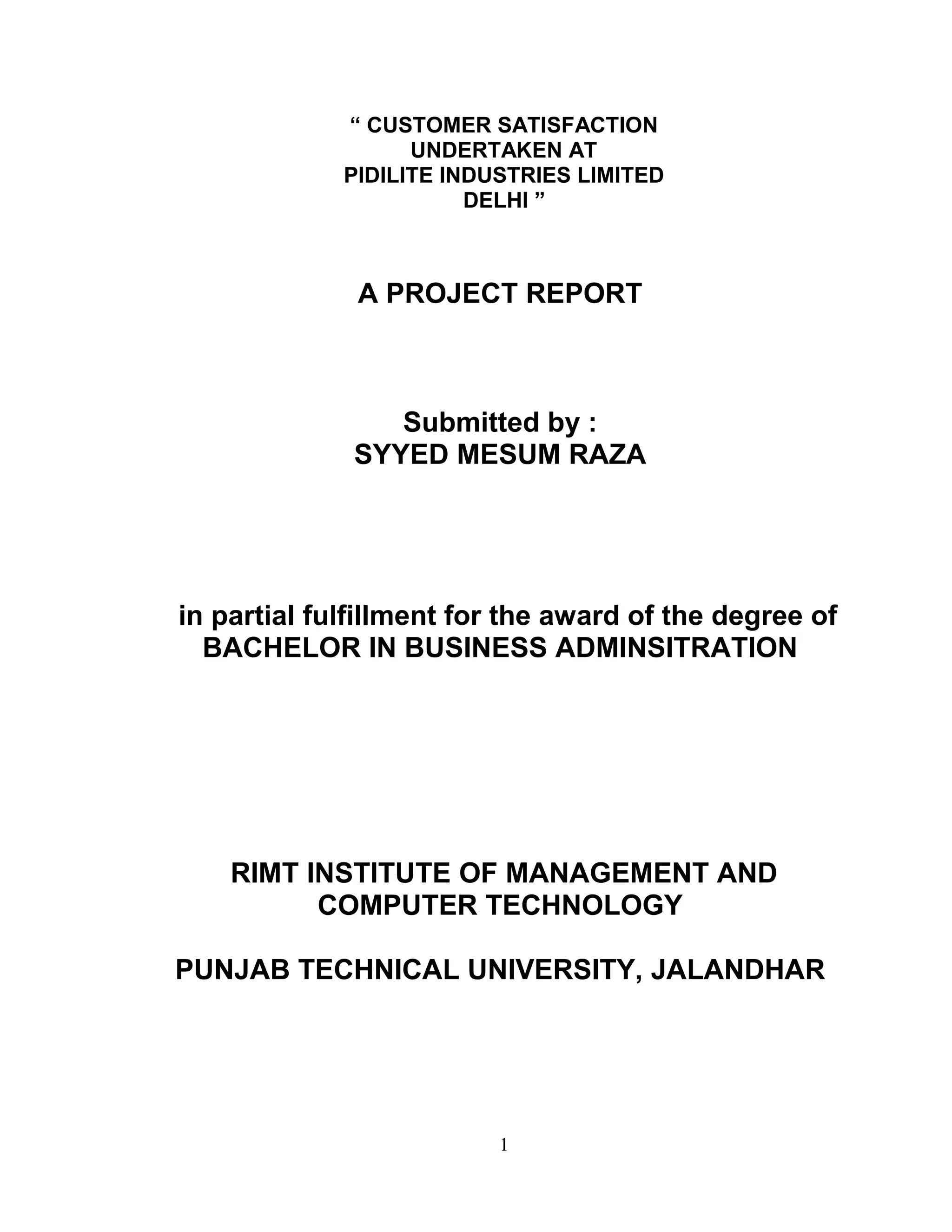 This document appears to be a project report submitted by Syyed Mesum Raza for their Bachelor of Business Administration degree. The report focuses on customer satisfaction at Pidilite Industries Limited in Delhi. It provides an acknowledgment, declaration, table of contents, and introduction to the company. Pidilite Industries Limited is an Indian company that pioneered consumer and specialty chemicals in India. It is a market leader in various product categories and has a large product range. The report will analyze customer satisfaction of Pidilite's products.