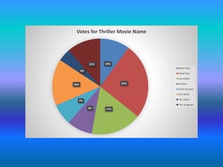 The document summarizes the results of a poll conducted to name an upcoming thriller movie. Dead Out received the most votes at 26% and was chosen as the preferred name by the group, as it referenced death, a common horror theme fitting for their film. Black Soul and Surrender also received significant votes at 10% and 17% respectively. The group plans to meet again to finalize the movie name.