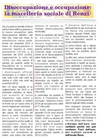 Il documento critica le politiche del governo Renzi sul lavoro e la disoccupazione, evidenziando l'aumento del tasso di disoccupazione e il deterioramento delle condizioni occupazionali, in particolare per i giovani. Sottolinea come il Jobs Act rischi di ridurre i diritti dei lavoratori e aumentare i licenziamenti, mentre la mancanza di investimenti e le misure austeritarie aggravano la situazione economica. Infine, si denuncia la confusione normativa creata dai decreti delegati e la scarsa trasparenza nelle decisioni governative.