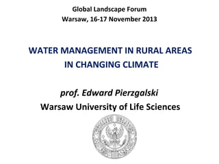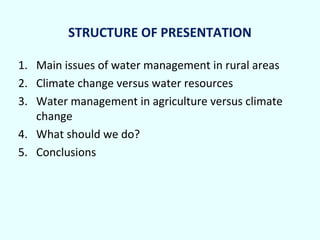 The document discusses water management in rural areas of Poland in the context of climate change, highlighting critical issues such as water quality, variability, floods, and droughts. It emphasizes the need for improved water resource management, including the development of new resources and the modernization of irrigation and drainage systems. The document also suggests strategies for mitigating greenhouse gas emissions and adapting to changing climatic conditions through various water management practices.