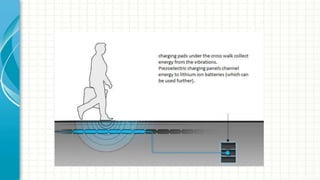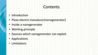 This document discusses piezoelectric transducers and nanogenerators. It describes how piezoelectric transducers can convert mechanical energy into electrical energy using zinc oxide nanowires. A nanogenerator contains an integrated circuit with nanowires that generate charge when bent by an applied force. Nanogenerators can harness energy from small vibrations in various applications like mobile phones, gyms, footwear, and more. While pollution-free and requiring low maintenance, they have limitations such as being prone to cracking and potential interference from stray voltages.