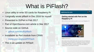 Piflash is a Linux utility designed to write bootable OS images onto SD cards for Raspberry Pi computers, ensuring safety by preventing accidental data loss on other disks. Originally developed in 2016 and presented in 2017, it includes features like automatic input file format detection and future plugin support for enhanced automation. The document also provides an overview of Raspberry Pi models, their specifications, and various operating systems available for installation.