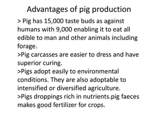 Pig production is one of the oldest domesticated animals found around the world. Pigs are a major source of meat, comprising 38% of world meat production. Pigs have advantages such as efficient conversion of feed to food, high growth rates, tolerance to various feeds and environments, and ability to improve soil fertility through manure. Proper pig raising requires adequate food, water, shelter, health care and space.