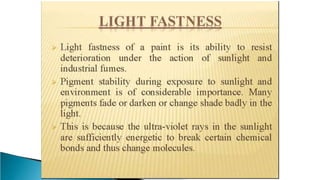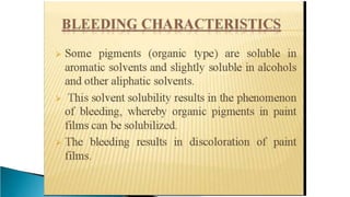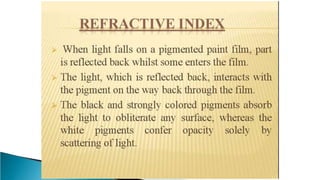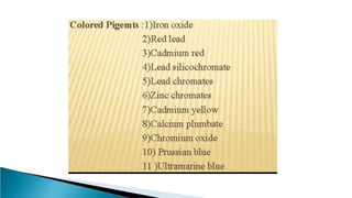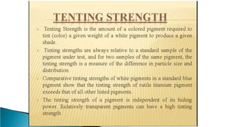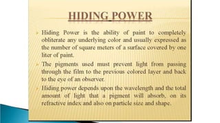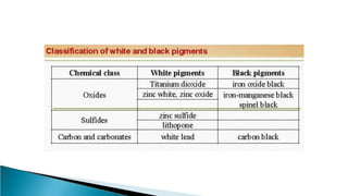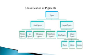Pigments are solid colored particles that are insoluble in the medium they are incorporated into and are used for their coloring properties. They can be classified as organic or inorganic based on their chemical structure and include substances like titanium dioxide, carbon black, iron oxides, cadmium pigments, and organic azo and phthalo pigments. Pigments are used to color paints, inks, plastics, fabrics, cosmetics, and other materials by selectively absorbing or scattering light. Key properties like hiding power, tinting strength, and light fastness are considered when selecting pigments for different applications.
