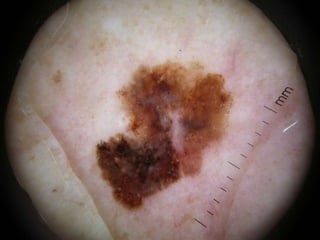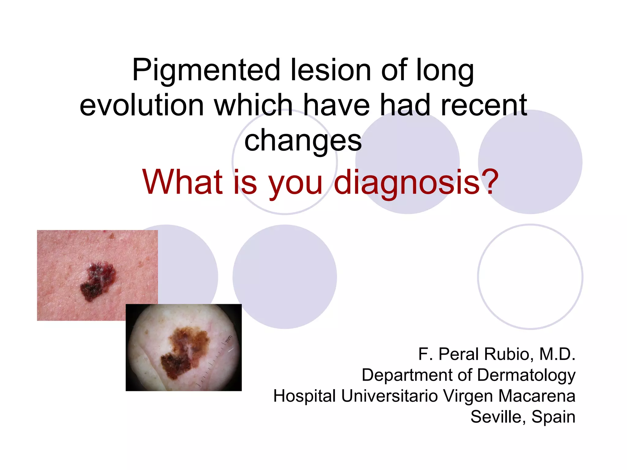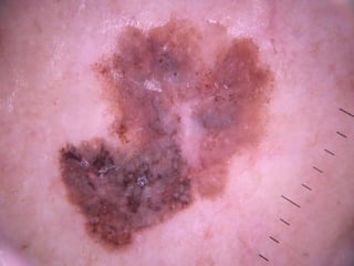 A 50-year-old woman presented with a pigmented lesion on her cheek that had been present for 20 years but recently changed. The dermatologist must determine a diagnosis for the pigmented lesion that has a long history but new changes.