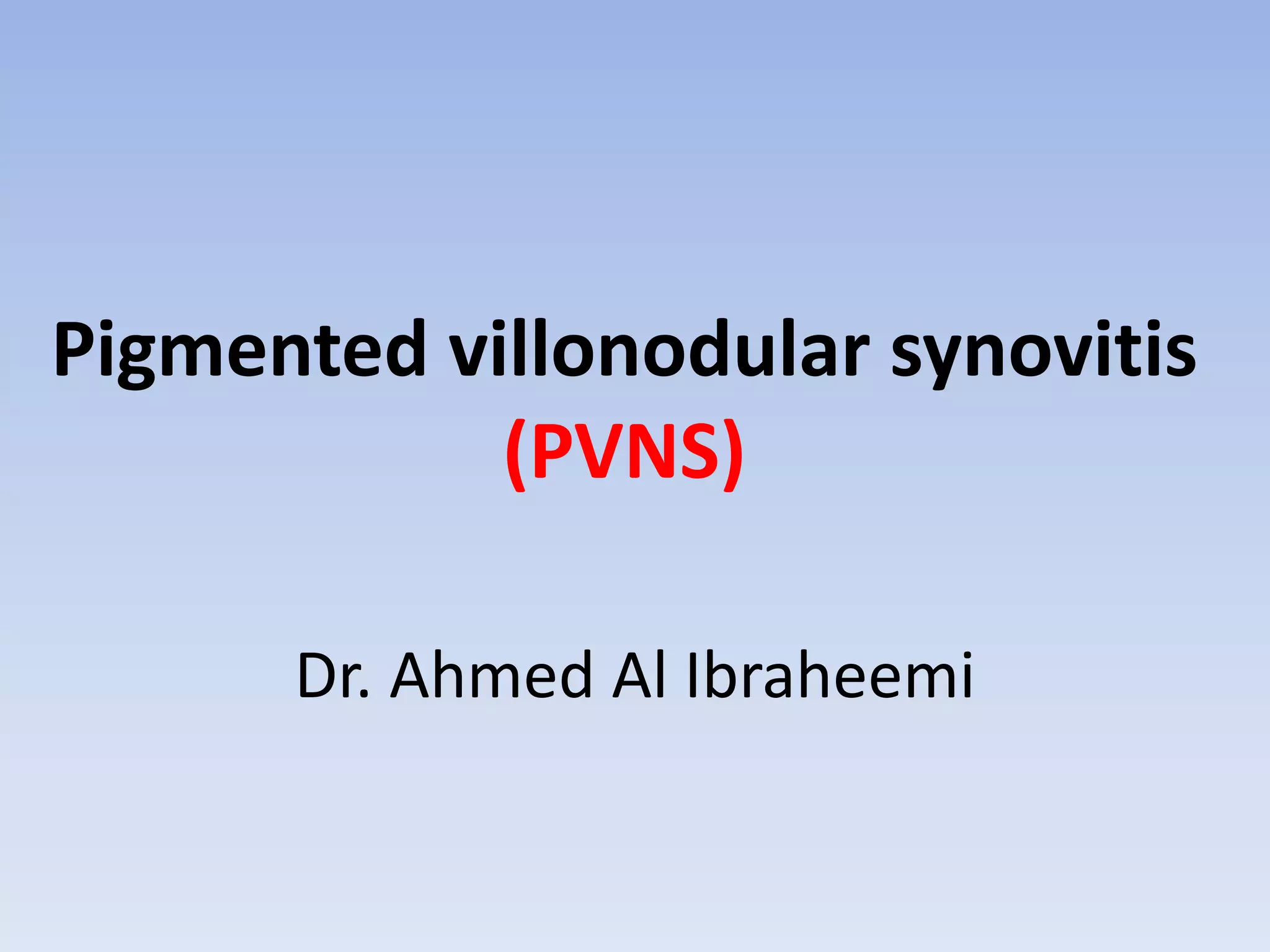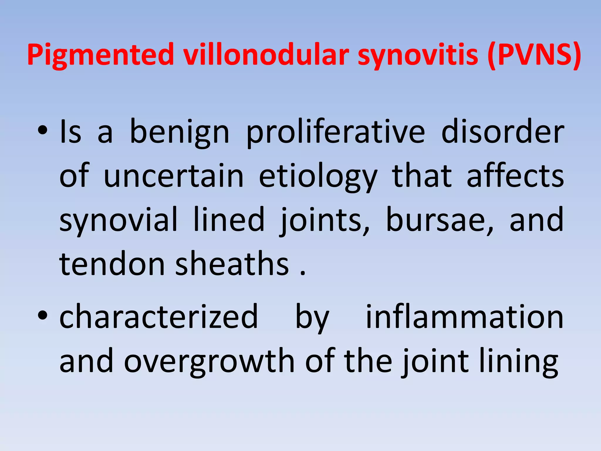 Pigmented villonodular synovitis (PVNS) is a benign proliferative disorder of unknown cause that affects synovial joints, bursae, and tendon sheaths. It is characterized by inflammation and overgrowth of the joint lining. There are two primary forms - a diffuse form affecting the entire synovial lining and a rare localized form occurring in small joints. While the cause is unknown, it is thought to be neoplastic in nature. Treatment involves complete surgical resection or radiation therapy to prevent recurrence, as incomplete removal can allow regrowth. Radiation therapy provides effective local control with minimal side effects.