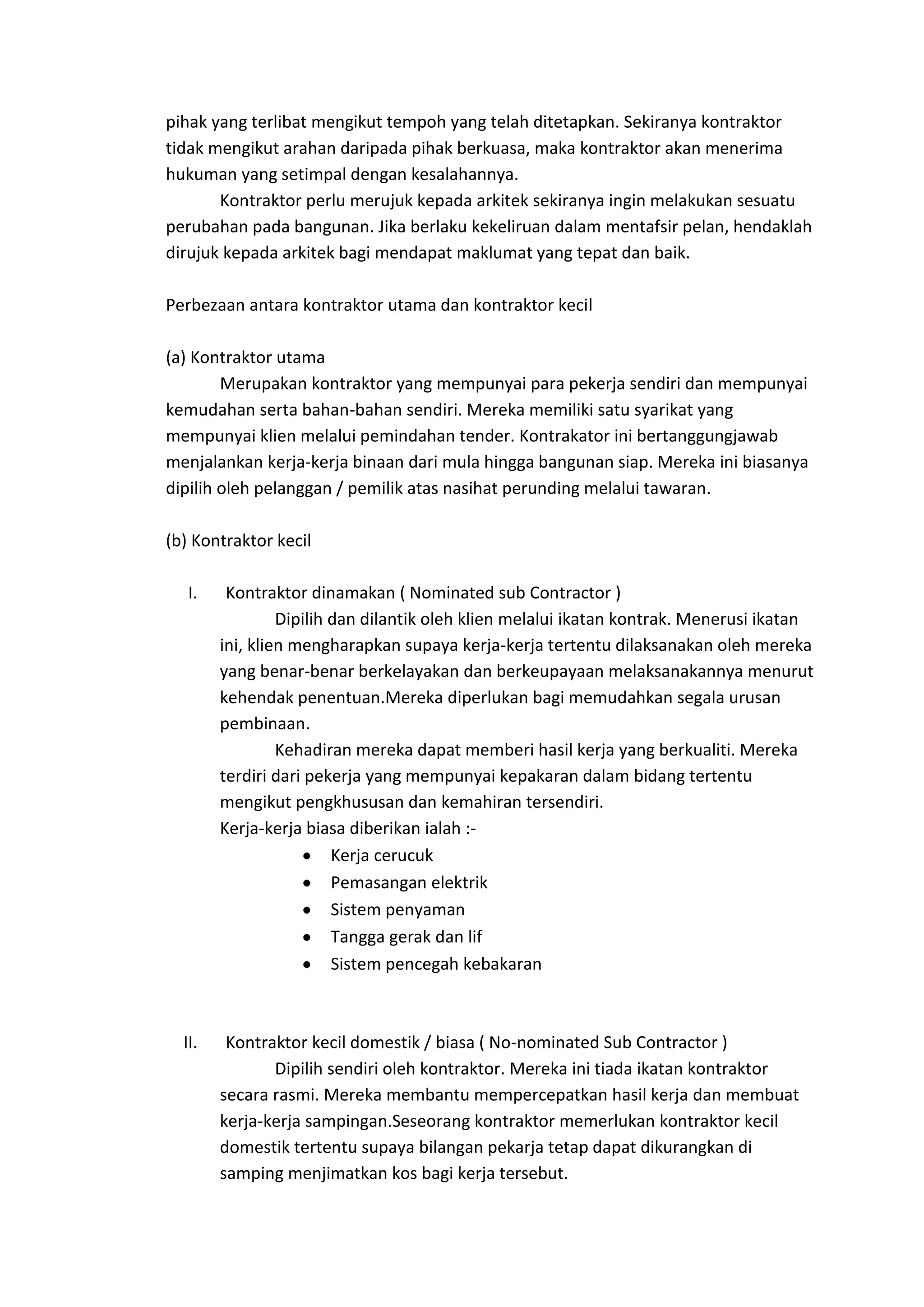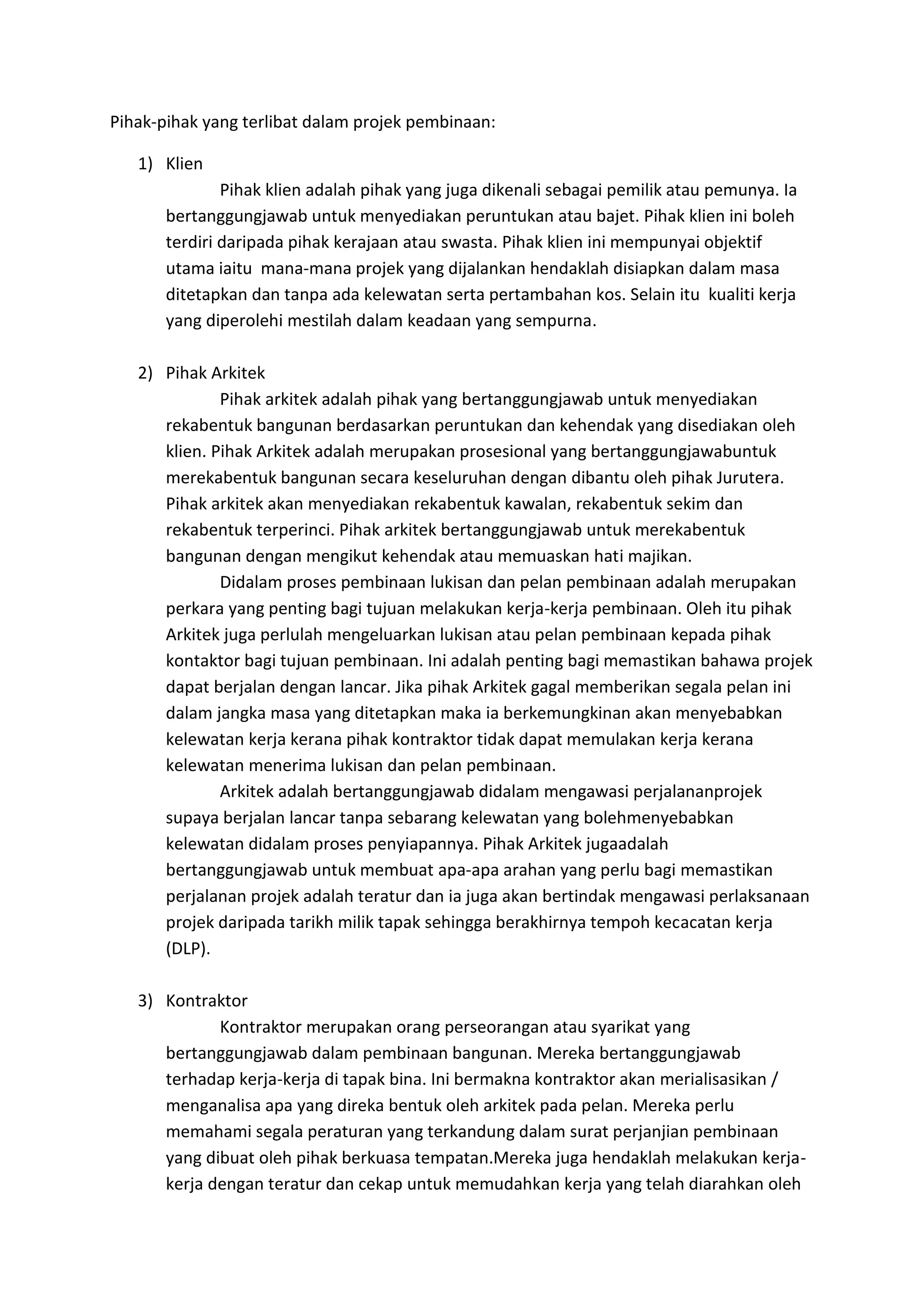 Dokumen ini menjelaskan pelbagai pihak yang terlibat dalam projek pembinaan, termasuk klien, arkitek, kontraktor, jurutera, pengurus projek, dan juruukur bahan. Setiap pihak mempunyai tanggungjawab dan peranan tertentu, dari penyediaan bajet hingga reka bentuk dan pelaksanaan kerja di tapak bina. Kegagalan memenuhi tanggungjawab yang ditetapkan oleh mana-mana pihak boleh menyebabkan kelewatan dan masalah dalam proses pembinaan.