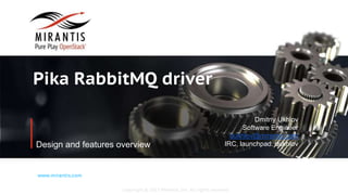The document discusses the design and features of a new Pika RabbitMQ driver being developed to replace an existing Kombu driver. Key changes in the Pika driver include using different exchange types for different message types, optional persistence only for notifications, queues and exchanges with expiration periods, and a new approach for clients to declare queues for notifications. The driver aims to improve performance by using direct exchanges where possible and utilizes features of the Pika library like its own reconnection mechanism and heartbeat.