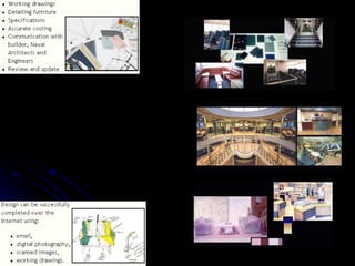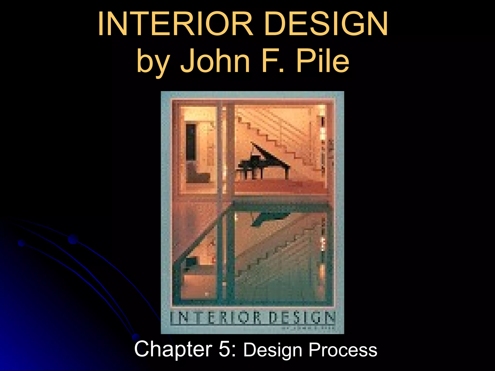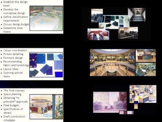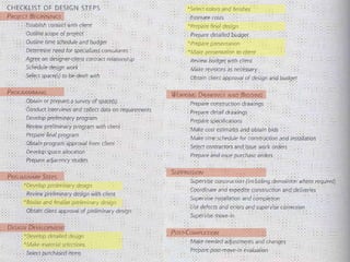 The document summarizes the typical steps involved in the interior design process, from initial client contact through construction. It discusses: