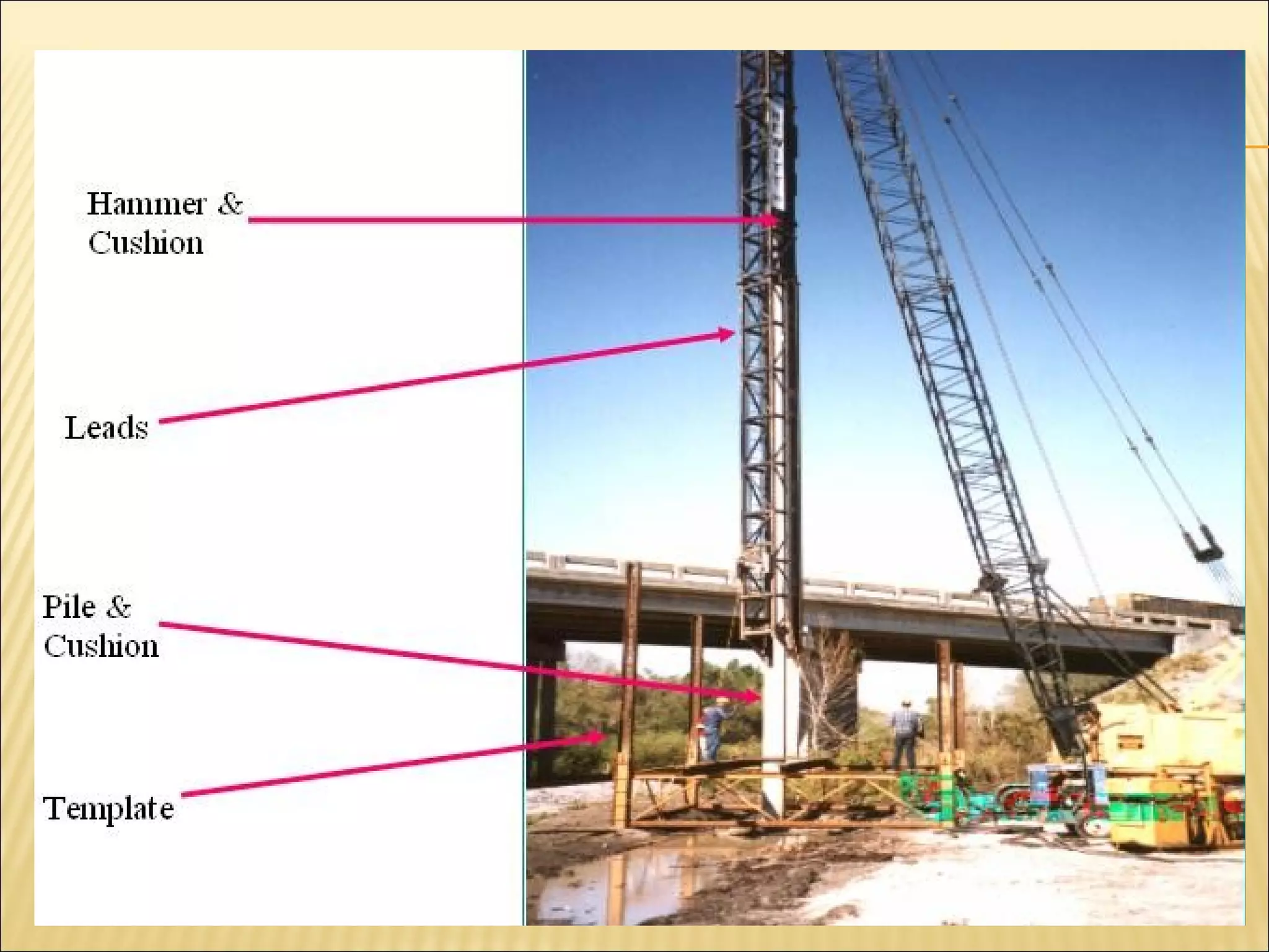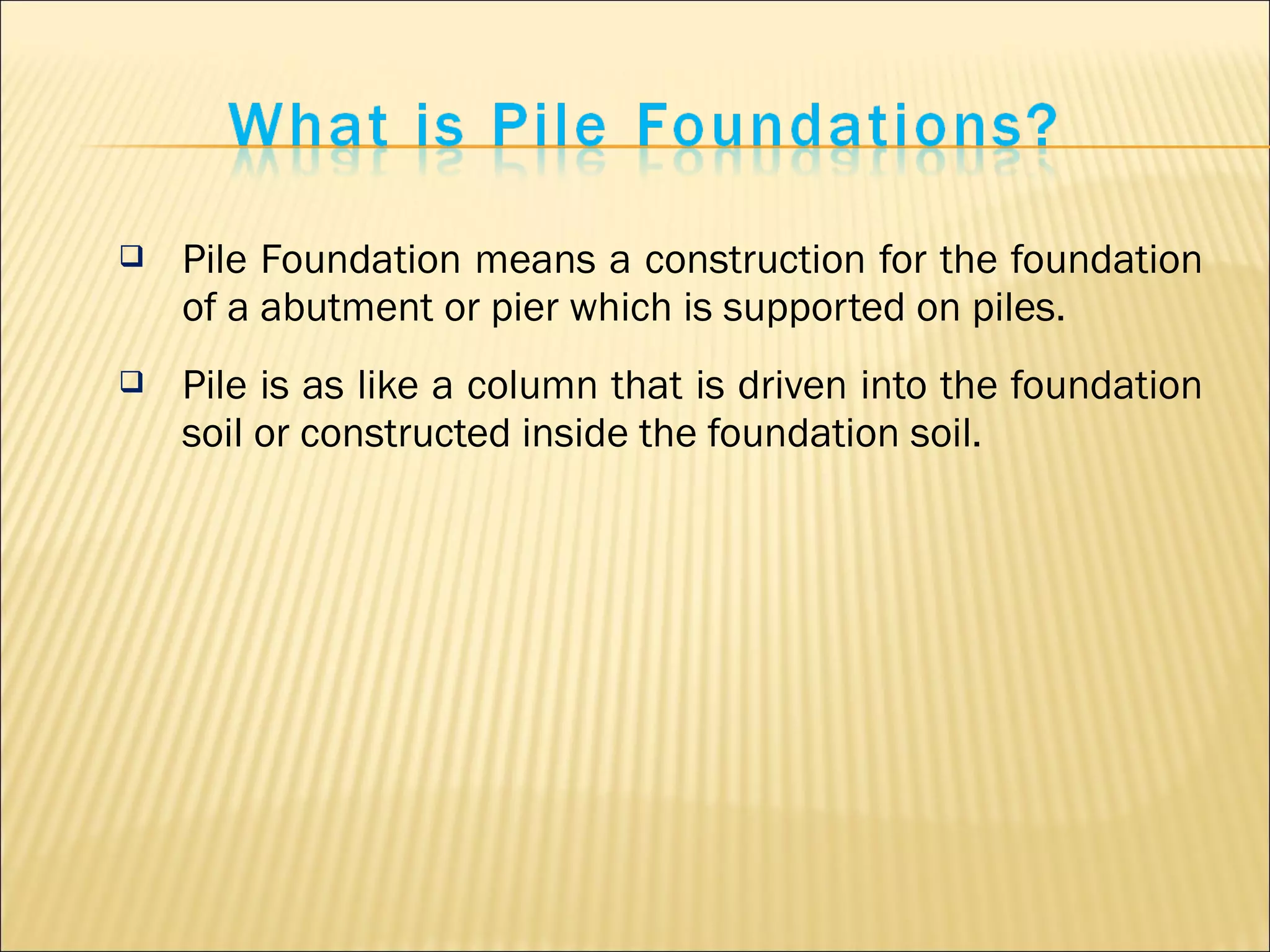 Pile foundations are used when the bearing capacity of soil is low or uneven and the soil is located at a greater depth. Piles transfer structural loads directly to the soil layer below by end bearing or side friction. Common pile types include timber, concrete, steel, and composite piles which are classified based on function, material, and installation method. Pile foundations provide solutions for difficult soil conditions like compressible, waterlogged, or made ground and are widely used for bridges, buildings, and marine structures.