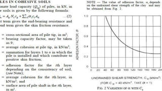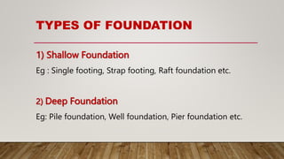 This document discusses pile foundations and provides classifications and details regarding pile types, requirements, construction, testing, and load determination. It defines a pile foundation as a deep foundation system that uses slender columns (piles) made of materials like concrete or steel to transfer structural loads into soil. Piles can be classified based on construction method (driven, bored), material (wood, steel, concrete), and load transfer mechanism (end bearing, friction, combined). Key factors requiring pile foundations and details regarding pile spacing, installation, concreting, and testing methods are also summarized.