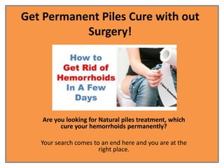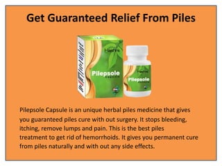 This document advertises Pilepsole capsules as a natural treatment for hemorrhoids that provides permanent cure without surgery. It claims Pilepsole stops bleeding, itching, and removes lumps and pain, making it the best piles treatment. The medicine comes from an ancient Ayurvedic formula and gives guaranteed relief from hemorrhoids in 10 days by shrinking and eliminating lumps as it brings swollen veins back to normal.