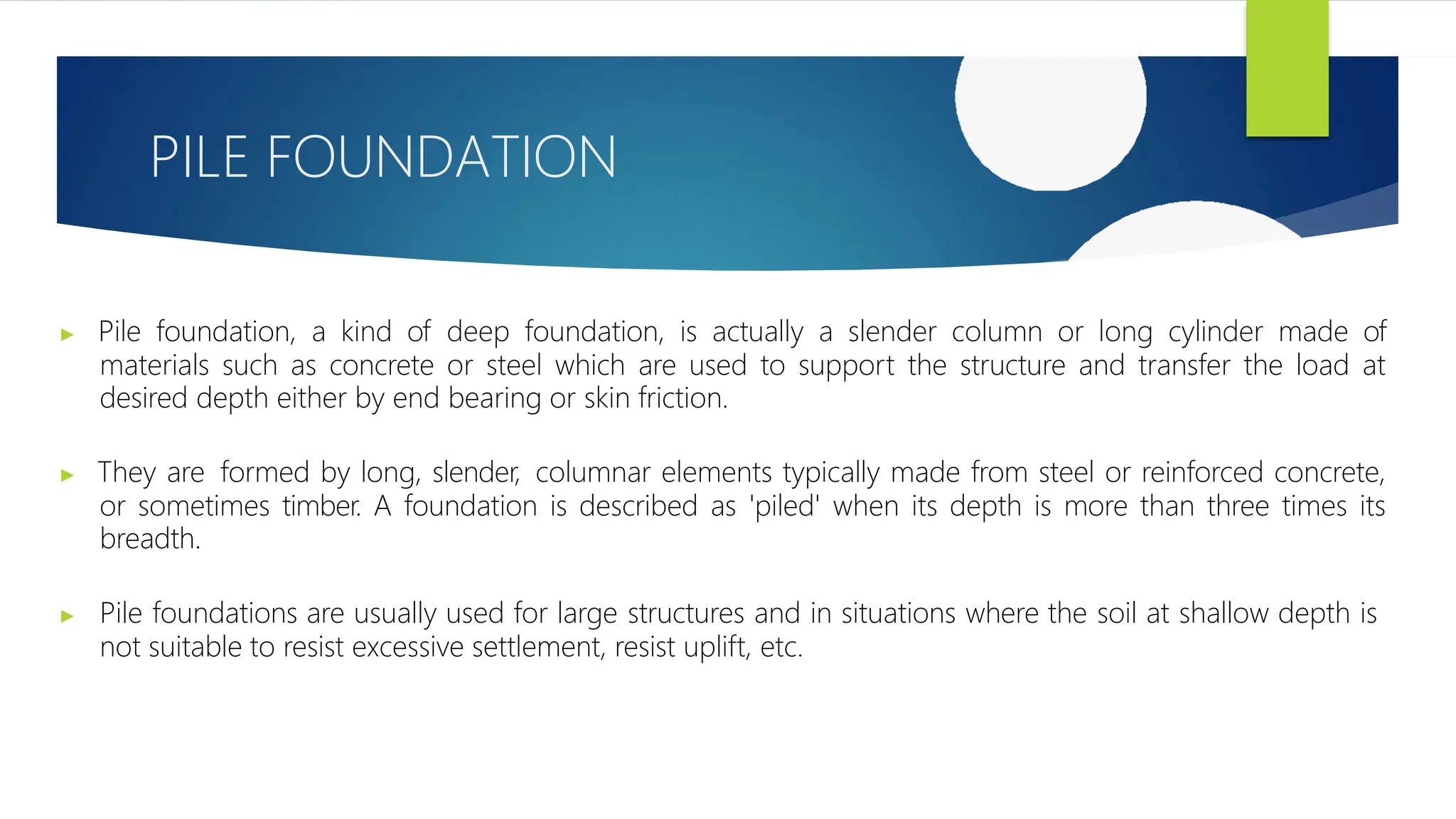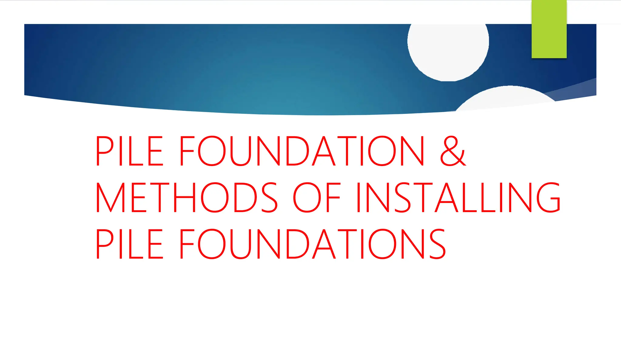 This document discusses pile foundations and methods of installing pile foundations. It defines pile foundations as slender columns made of materials like concrete or steel that support structures by transferring loads into the ground through end bearing or skin friction. It describes different types of pile foundations including sheet piles, load bearing piles, end bearing piles, friction piles, and different materials used like timber, steel, pre-cast concrete, and cast-in-place concrete. It also summarizes methods of pile installation including rotary boring, continuous flight auger boring, tripod boring, and driving piles using drop hammers, single-acting hammers, double-acting hammers, diesel hammers, and vibratory hammers.