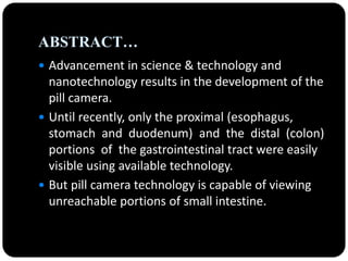 Pill camera technology allows a miniature camera to be housed in a capsule and passed through the digestive tract to provide images of the small intestine. The capsule captures images as it is propelled through the tract and transmits them to an external recorder. This provides a painless alternative to endoscopy for diagnosing conditions like cancer by visualizing areas that standard techniques cannot reach. The capsule offers advantages over endoscopy like being non-invasive and allowing patients to avoid sedation and return to normal activities after swallowing.