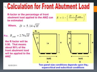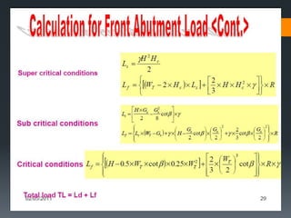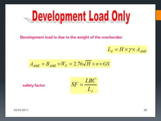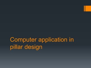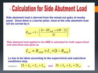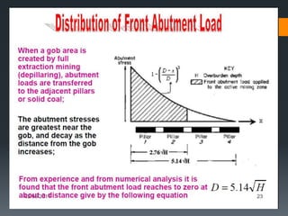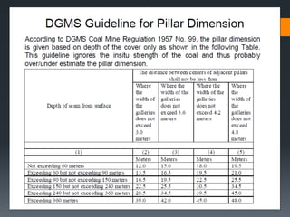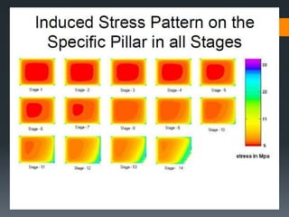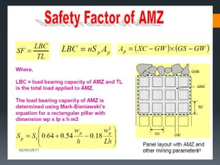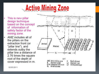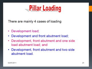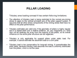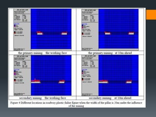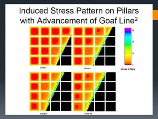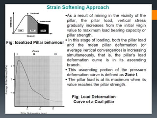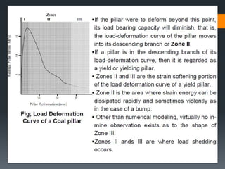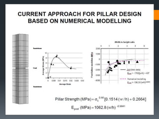 This document discusses various approaches to coal pillar design, including ultimate strength, progressive failure, and numerical modeling. It describes traditional empirical pillar strength formulas that estimate pillar load and strength to calculate a safety factor. These formulas generally relate pillar strength to properties like width, height, and material strength. The document also discusses pillar loading estimation using tributary area concepts and numerical simulation and testing of pillar size and plastic deformation zones under different widths.