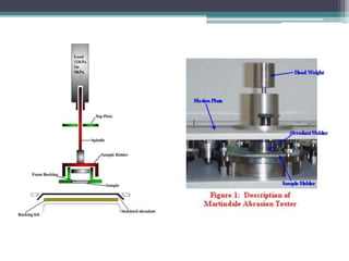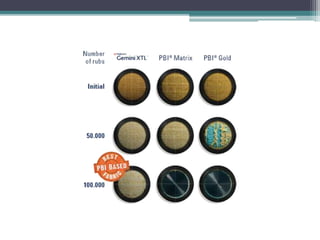 This document discusses methods for determining the performance of woven fabrics, including pilling resistance, abrasion resistance, tear strength, and breaking strength. It describes common tests for each property, such as the ICI pilling box test and Wyzenbeek abrasion test. Pilling is caused by fiber mobility and tangling, and is rated on a scale from 1 to 5. Abrasion resistance depends on fiber type, properties, twist, and fabric structure. Tear and breaking strength measurements use methods like the strip, grab, and rip tests.