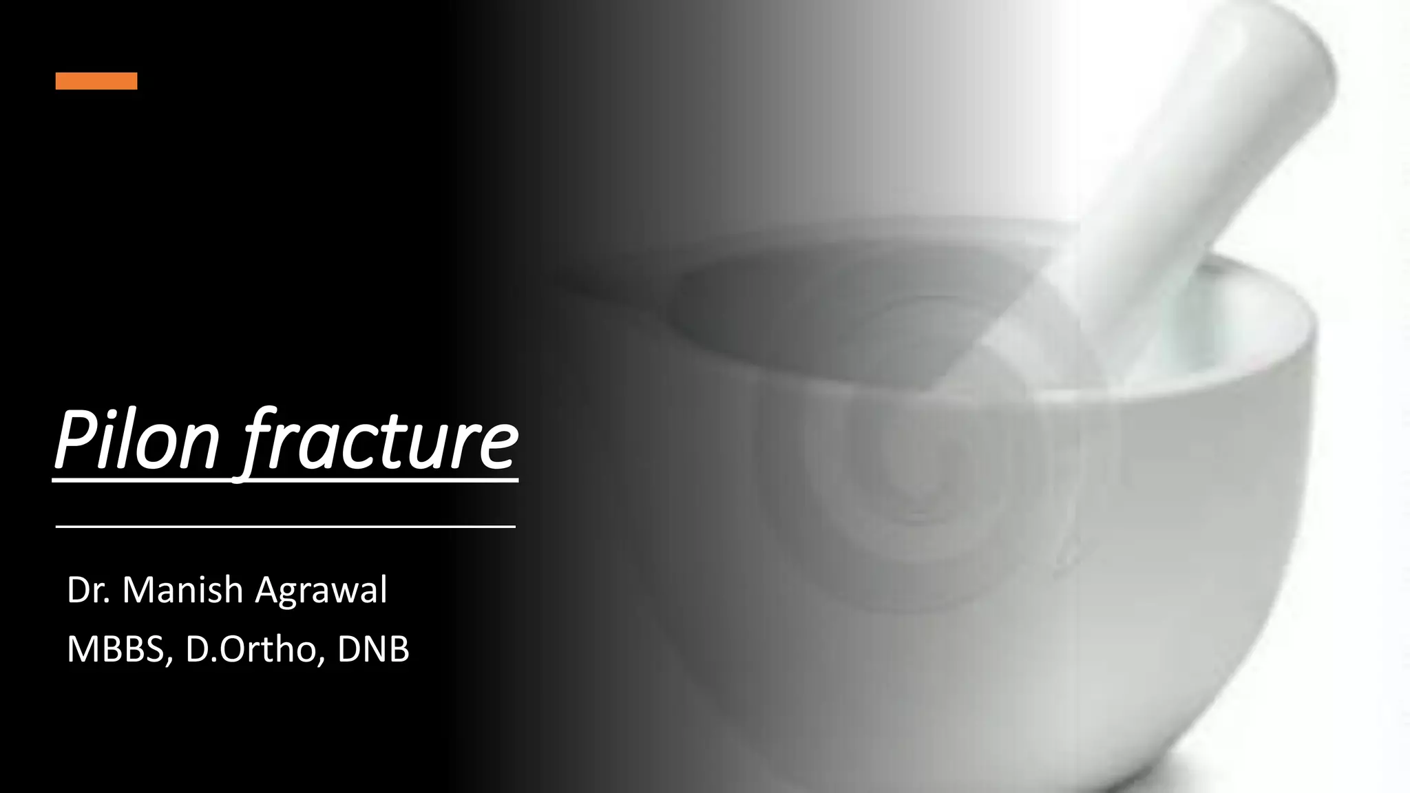 Pilon fractures involve the distal articular surface of the tibia. They account for 7-10% of tibial fractures and usually result from high-energy injuries. Classification systems categorize pilon fractures as extra-articular, partial articular, or complete articular, with complete fractures having significant articular comminution. Treatment goals are anatomical reduction, axial alignment, joint stability, and union. Options include casting, external fixation, limited internal fixation, and open reduction with staged procedures to address soft tissue status. Complications can include skin necrosis, nonunion, stiffness, infection, and arthritis.