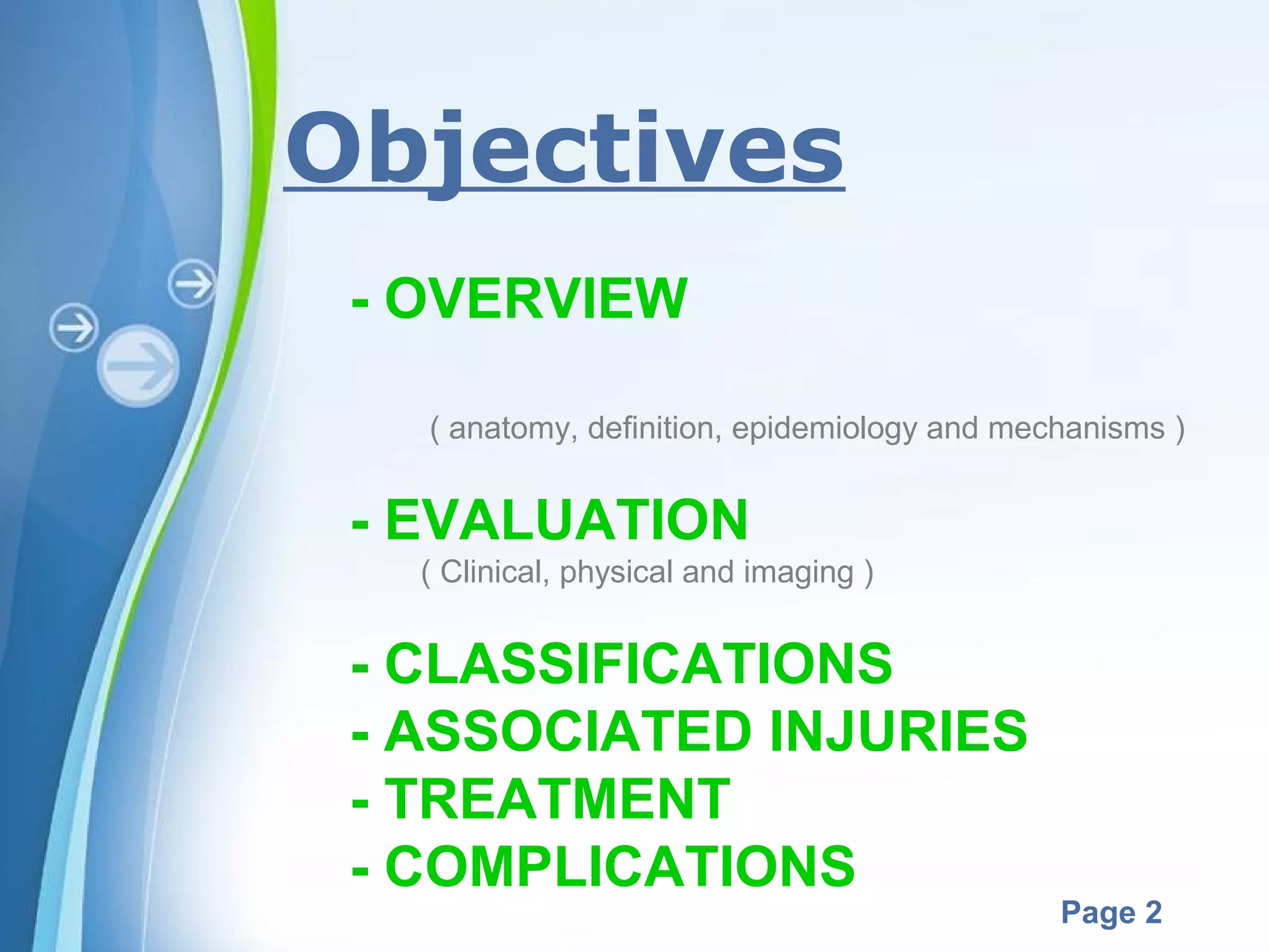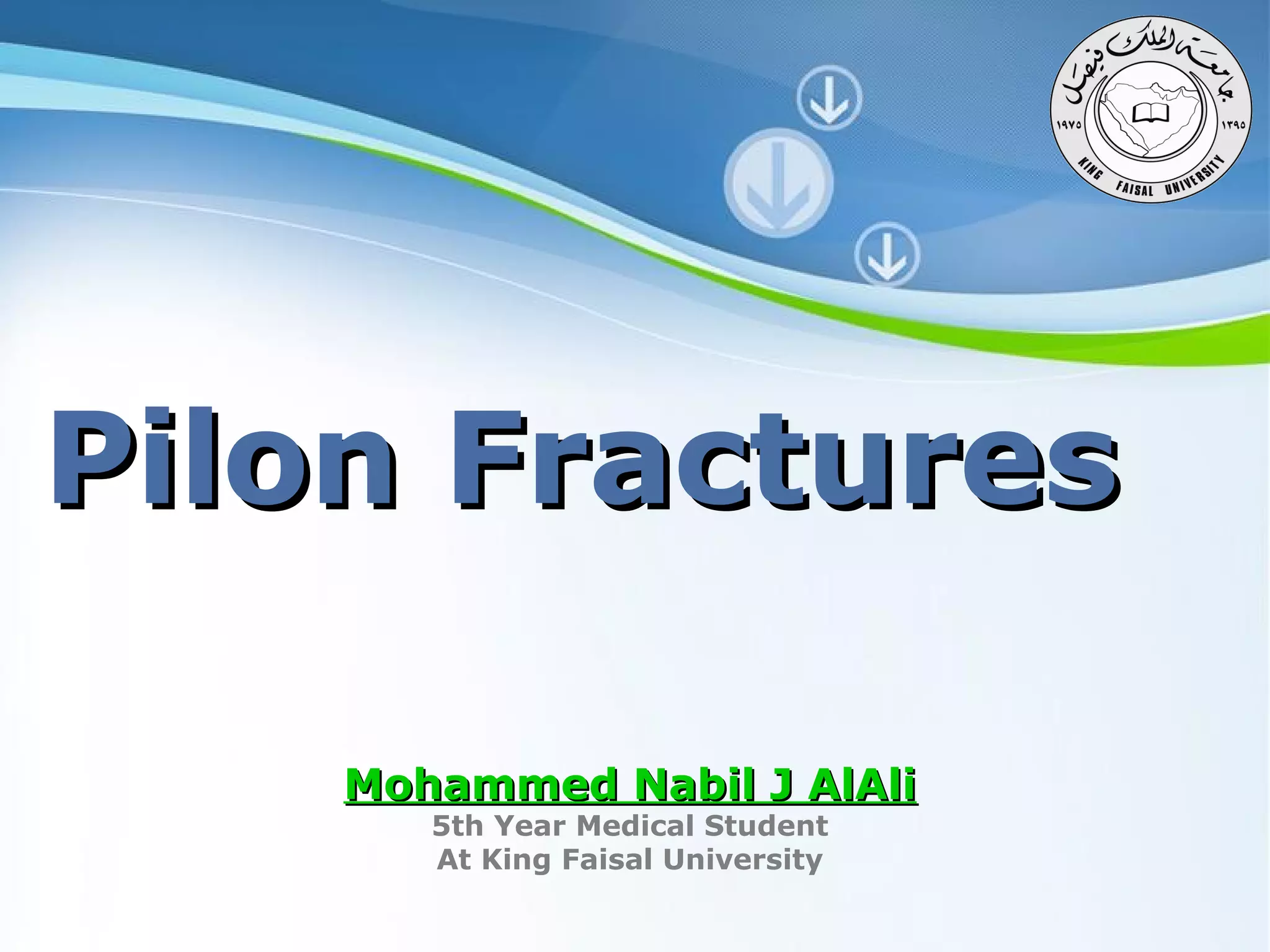 This document is a presentation on Pilon fractures, which are intra-articular fractures of the distal tibia. The presentation covers the anatomy, definition, epidemiology, mechanisms of injury, evaluation including clinical presentation, physical exam and imaging, classifications systems, associated injuries, treatment goals and options, complications, and surgical techniques for treatment. The overall objectives are to provide an overview of Pilon fractures and discuss evaluation, classification, treatment and complications.