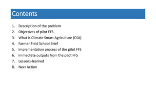 This document describes a pilot farmer field school on climate-smart agriculture in vegetable growing and chicken rearing. It discusses the problems farmers face from climate change impacts, objectives to improve production and incomes, and implementation of 4 field schools. Key outputs were improved understanding of climate-smart practices, increased yields and incomes, and lessons on effective facilitation. Next steps recommended continuing support, integrating climate concepts, promoting dissemination, and strengthening groups for sustainability.