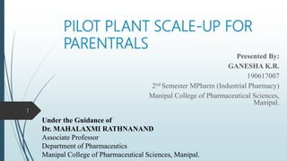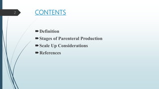 This document discusses the scale-up considerations for producing parenteral drugs on a pilot plant scale. It describes the key unit operations in parenteral production as mixing, sterilization, filtration, filling and sealing. For each unit operation, parameters that must be considered for scale-up are identified, such as tank size and type, impeller design, membrane size, filling rate and container size. Maintaining sterility and avoiding issues like precipitation or clogging are important challenges addressed during scale-up. Quality control tests are used to evaluate the scaled processes. Proper scale-up allows efficient transition from laboratory to commercial production of injectable drug products.