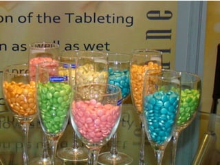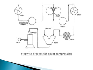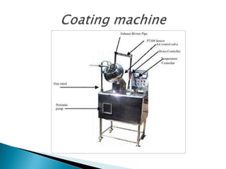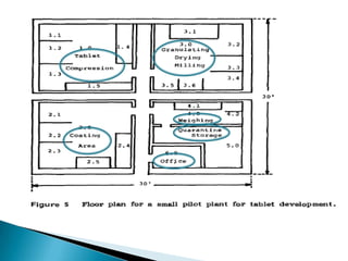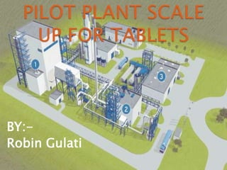 This document discusses the design and scale up considerations of pilot plants for tablet manufacturing. It begins by defining a pilot plant and its significance in transforming a lab-scale formula into a viable product. The objectives of the pilot plant include producing stable dosage forms, identifying critical process features, and providing information to support larger scale production. The document then discusses various unit operations involved in tablet manufacturing like material handling, blending, granulation, drying, milling, blending, compression, and coating. It provides details on equipment selection and process parameters that must be considered during scale up for each unit operation to ensure quality and reproducibility at production scale.
