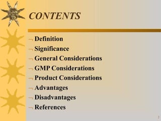 This document discusses techniques for scaling up pilot plant operations in the pharmaceutical industry. It begins with definitions of key terms and explains the significance of pilot plants in permitting examination of formulas at an intermediate scale. The document outlines general considerations for pilot plant operations, including personnel requirements, equipment used, production rates, and process evaluation. It also covers master manufacturing procedures, product stability testing, and GMP compliance. Advantages are given as personnel can observe scale up runs and quality materials can be accessed, while disadvantages include reduced interaction between formulators and production staff.