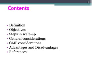 This document discusses pilot plant scale-up techniques for pharmaceutical manufacturing. It defines a pilot plant and scale-up process. The key steps in scale-up involve conducting laboratory and smaller pilot studies, designing and constructing a pilot plant, evaluating results to make corrections, and deciding whether to proceed to full-scale production. General considerations for a pilot plant include personnel requirements, equipment, production rates, process evaluation, and ensuring product stability and uniformity. GMP must also be followed in areas like process validation and documentation.