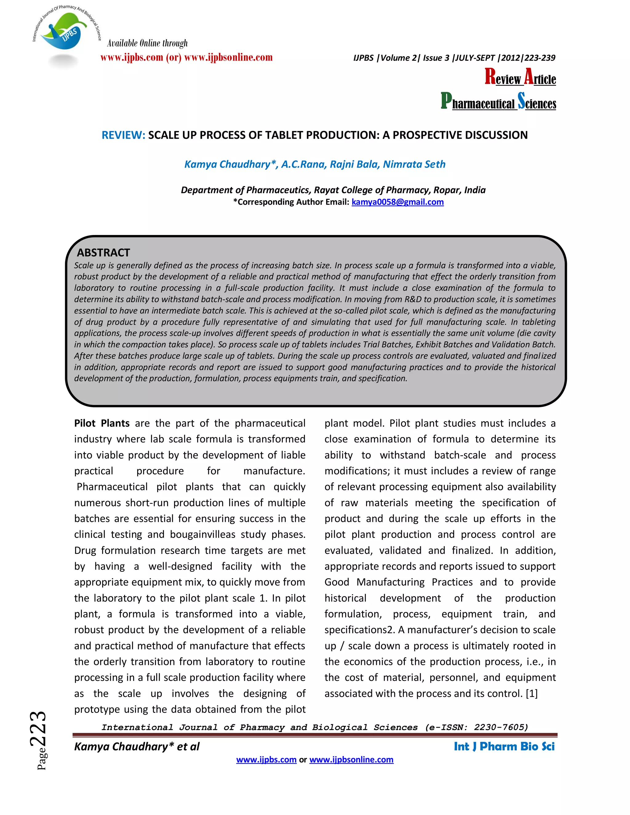 Pilot plant studies are important for transforming a lab scale formula into a viable product through development of a reliable manufacturing process. In pilot plants, process and production controls are evaluated and validated. Process scale up involves applying the same process to different output volumes or changing equipment/speeds. It provides information on critical formulation/process parameters and ensures quality and reproducibility at large scale. Key stages of tablet production include material handling, blending, granulation, drying, milling and compression. Granulation improves flow and uniformity while binders provide cohesion for bonding particles into tablets.